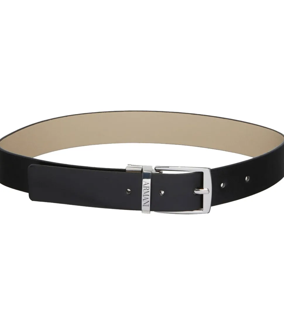 Emporio Armani bæltet lukkes med et stort, sølvfarvet metalspænde, og det kan justeres med fem huller. Spændet kan tages af og vendes, så det passer til den side, man ønsker skal vende udad. Bæltet er 3 cm bredt.