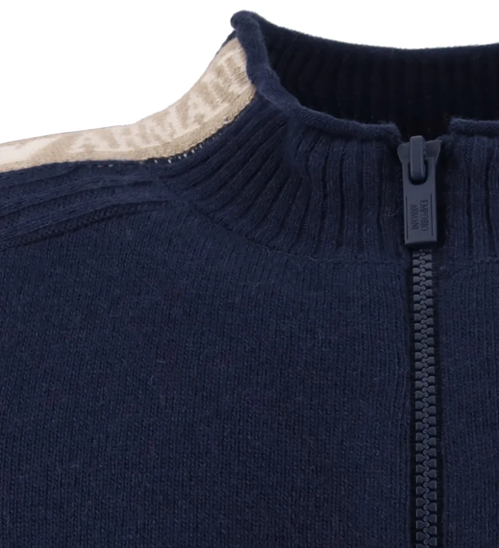 Lækker cardigan fra Emporio Armani i navyblå, og på det højre skulder er der en bred stribe i beige med navnet “Emporio Armani” i hvid.
