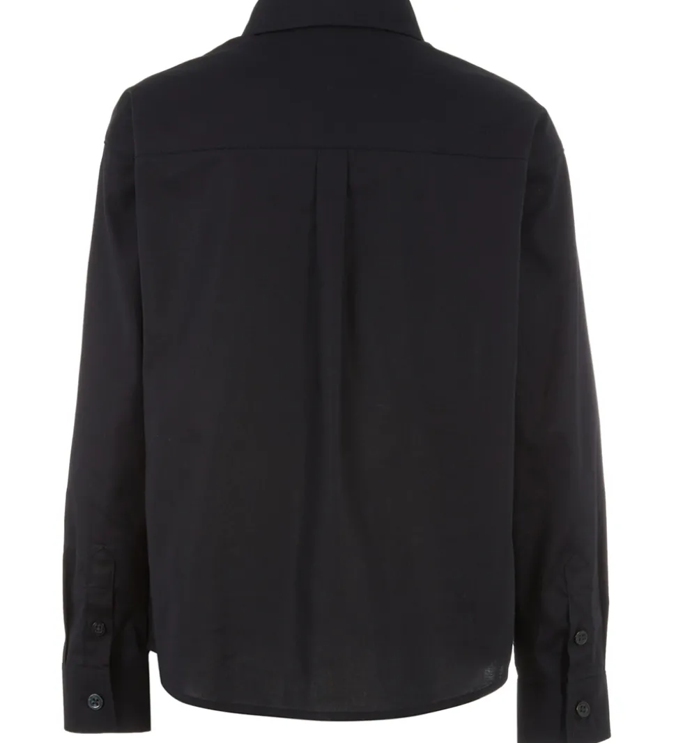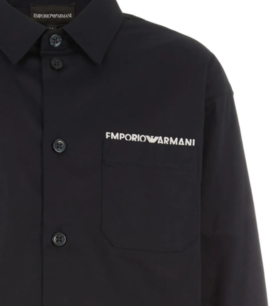 Lækker Emporio Armani skjorte i ensfarvet mørk navy i en let strækbar kvalitet, og fortil i venstre side står der “Emporio Armani” broderet i hvid.