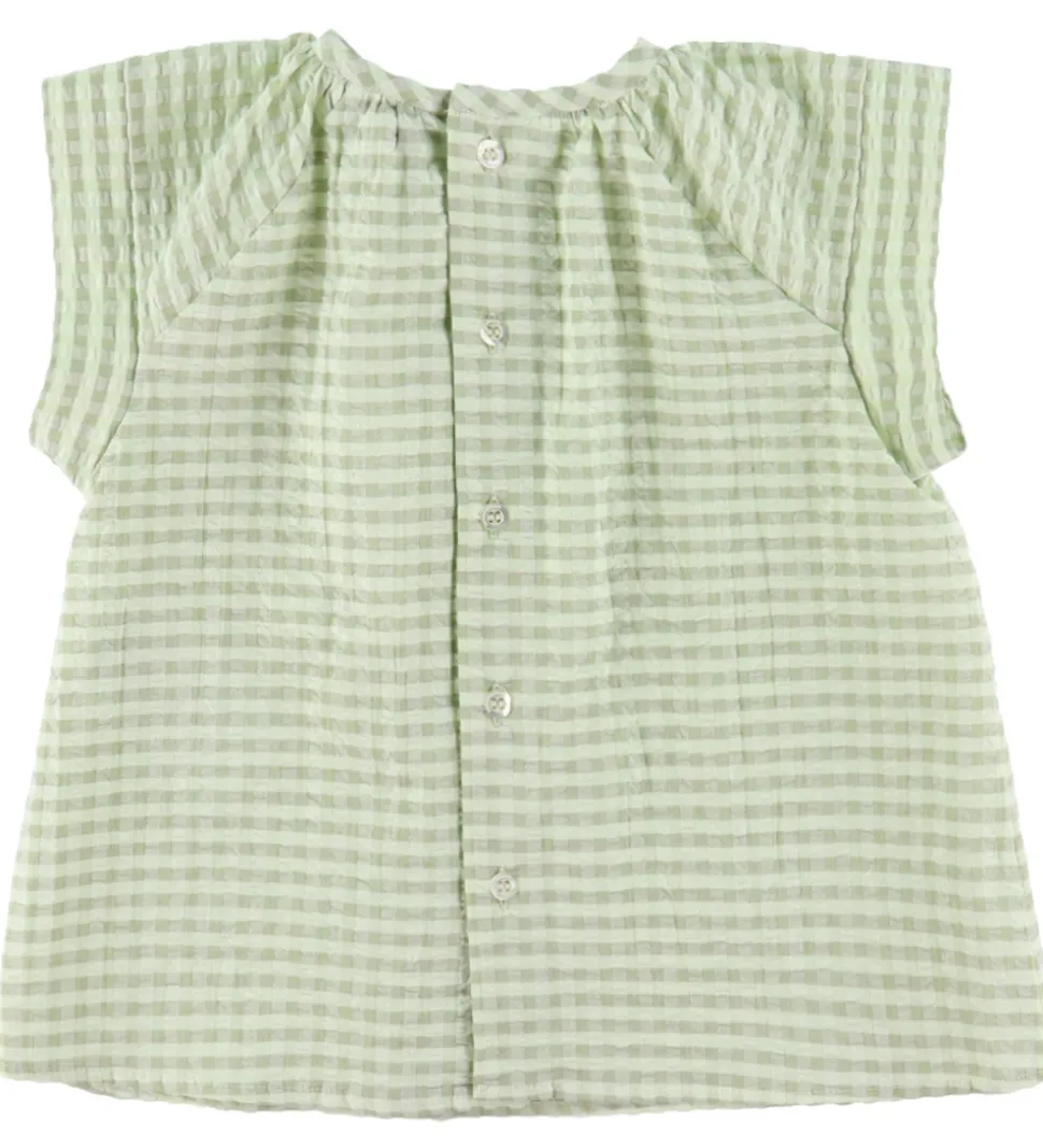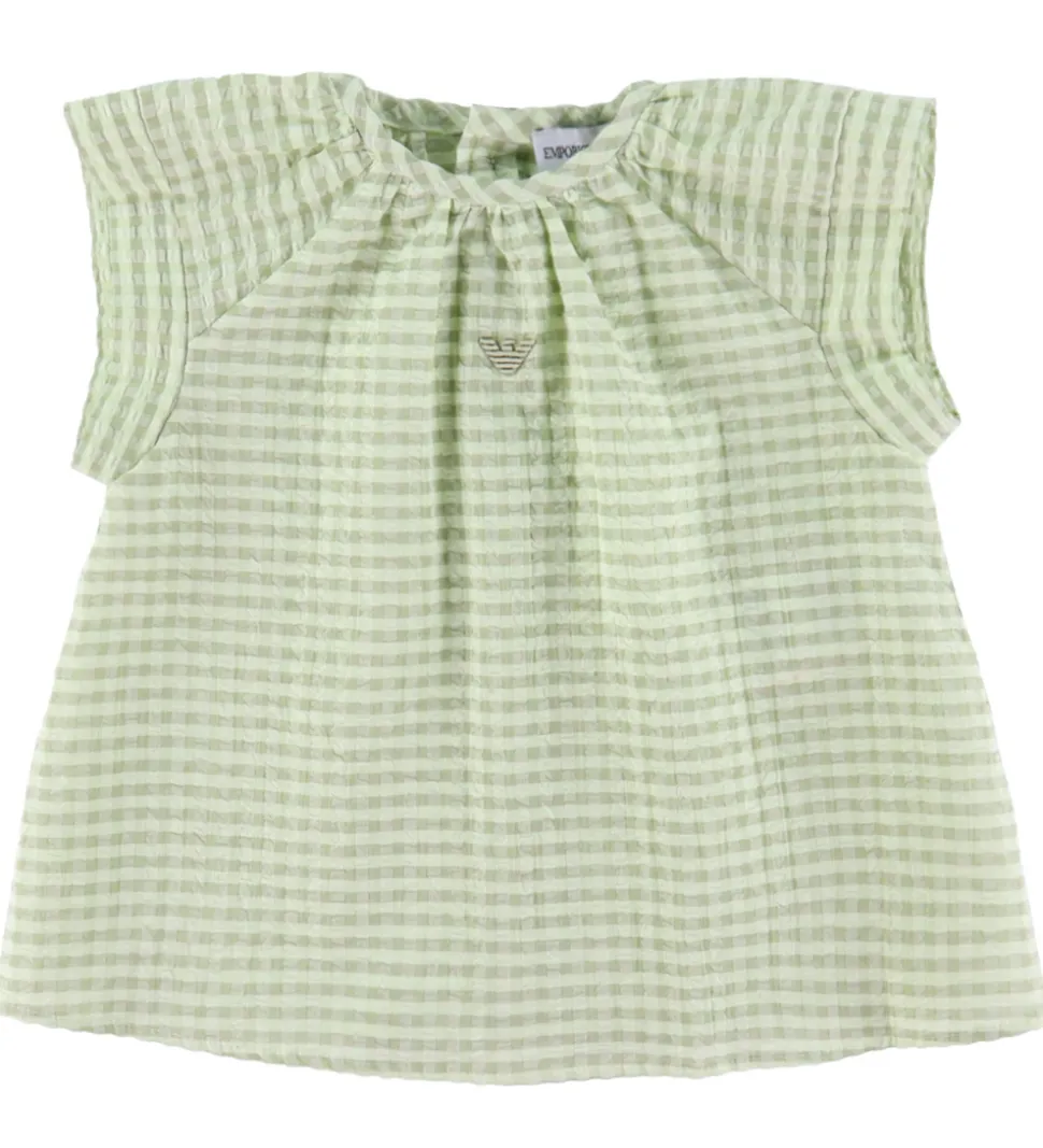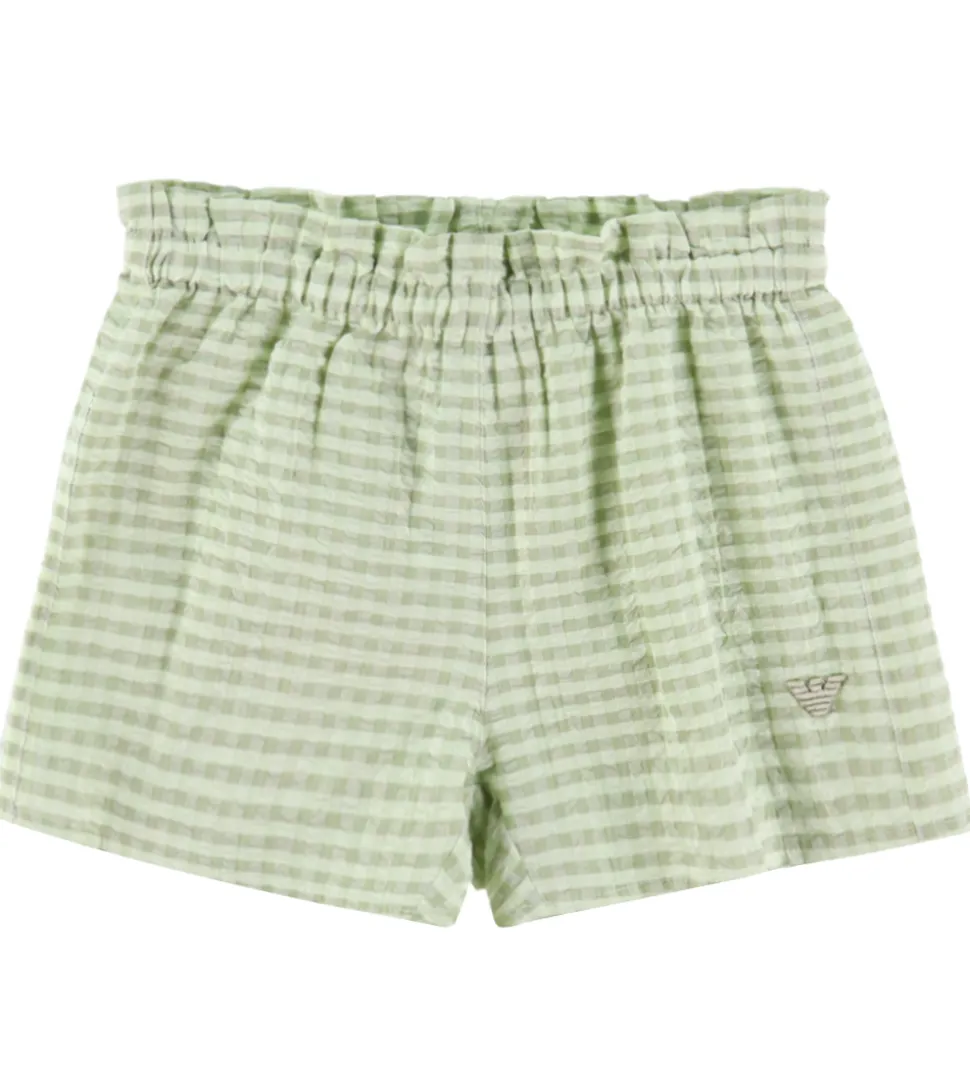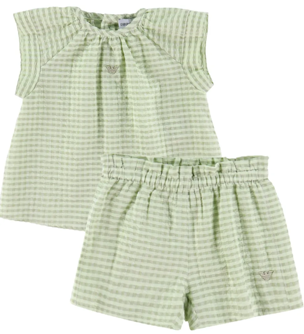 Sødt Emporio Armani sommersæt, der består af en top og et par shorts med et ternet mønster i rosa og hvid og med en crepestruktur. Sættet er lavet i en let, fastvævet bomuldskvalitet.