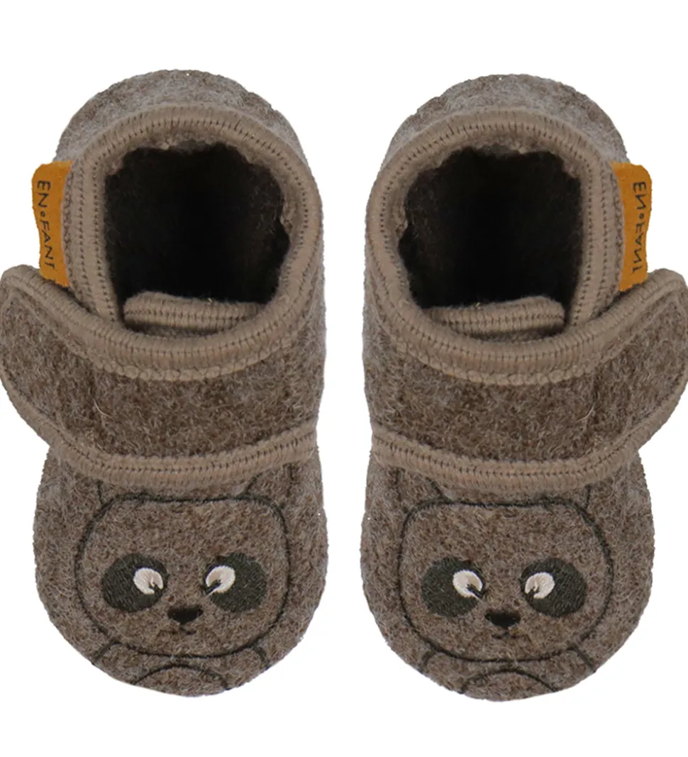 Lækre En Fant hjemmesko i mørkebrunt uld med en broderet bjørn på foden.