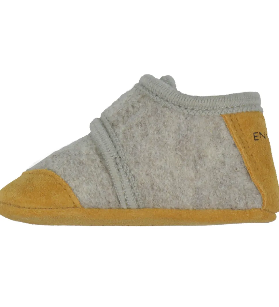 Fine En Fant hjemmesko i beigemeleret uld med lysebrunt ruskind på snuden og hælen.