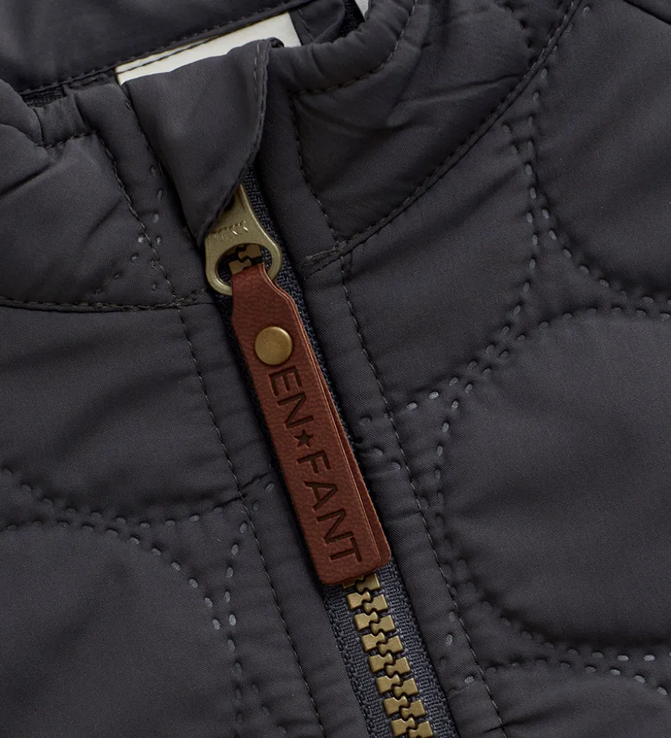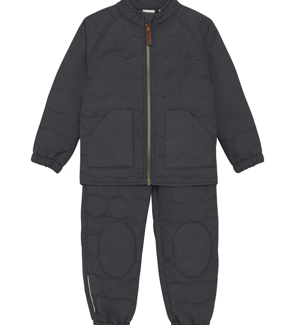 Fint En Fant termotøj i mørk koksgrå med en indpræget, quiltet struktur i runde cirkler. Sættet består af en termojakke og et par termobukser.