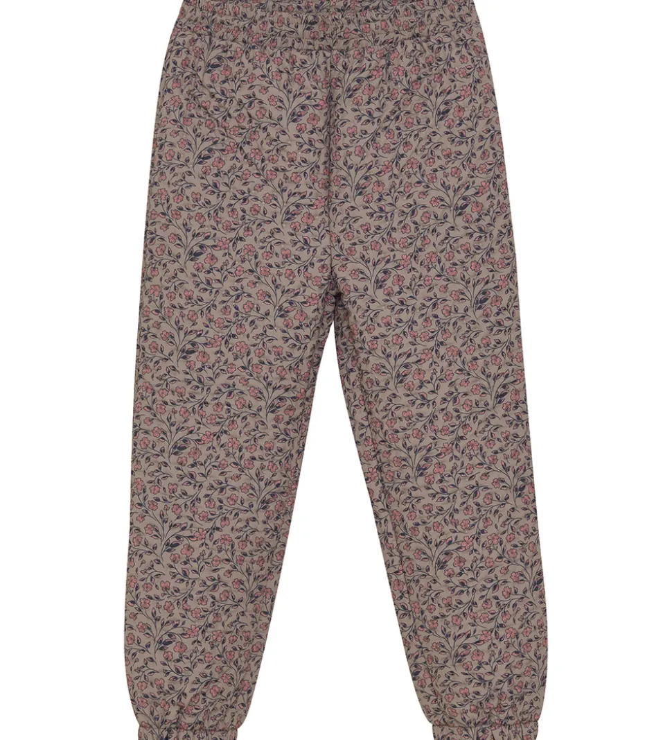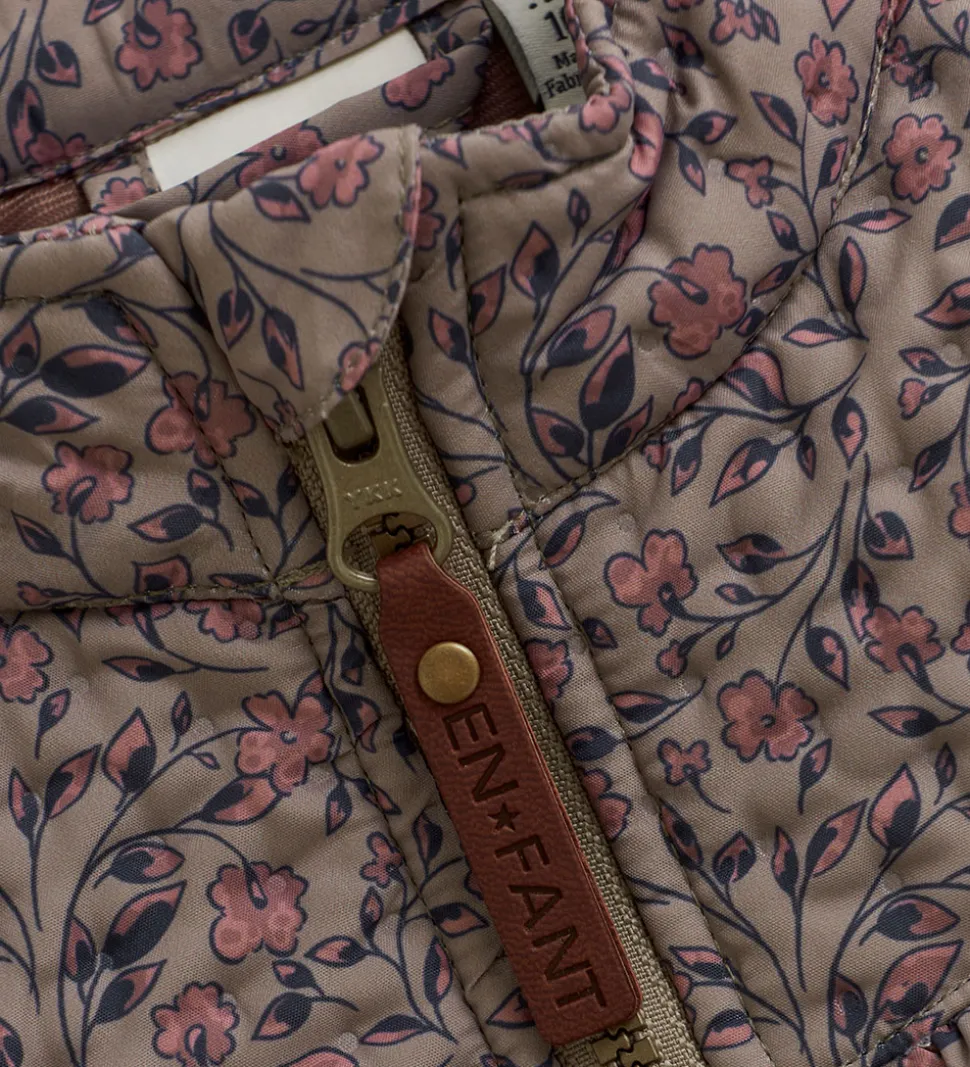 Fint En Fant termotøj i støvet brun med alloverblomsterprint i rosa og med en indpræget, quiltet struktur i runde cirkler. Sættet består af en termojakke og et par termobukser. Termojakken har flæsekant omkring brystet og over skuldrene.