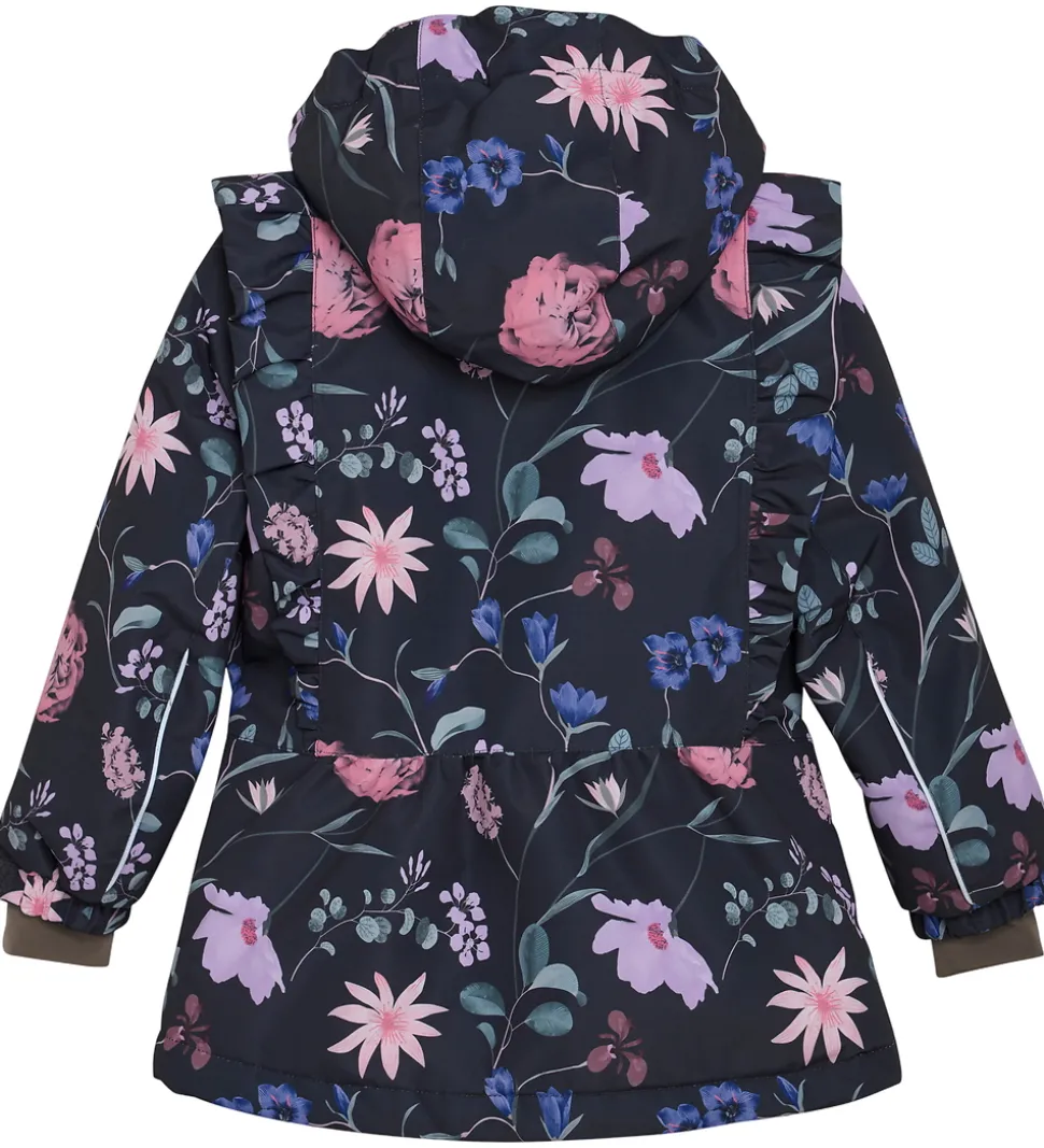 Skøn En Fant vinterjakke i mat sort med et alloverblomsterprint i rosa, lilla, blå og grønne farver.. Vinterjakken har flotte flæser over skuldrene.