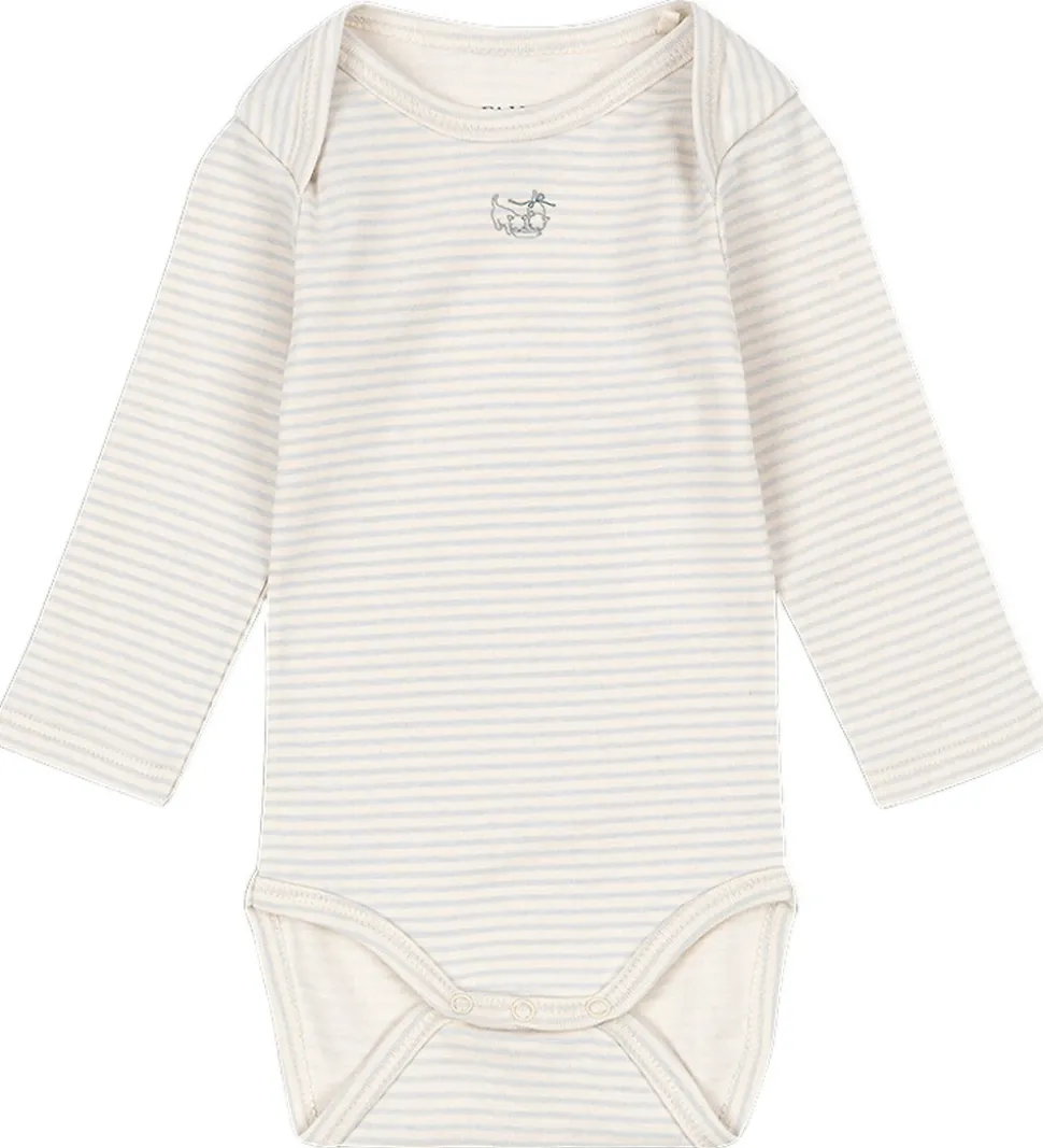 Praktisk Fanga Fontana body med lange ærmer og et stribet mønster i bløde nuancer af lyseblå og cremehvid. På brystet ses et enkelt, lille print af to katte. Bodyen er udstyret med ribkanter ved hals og håndled, der giver en god pasform.