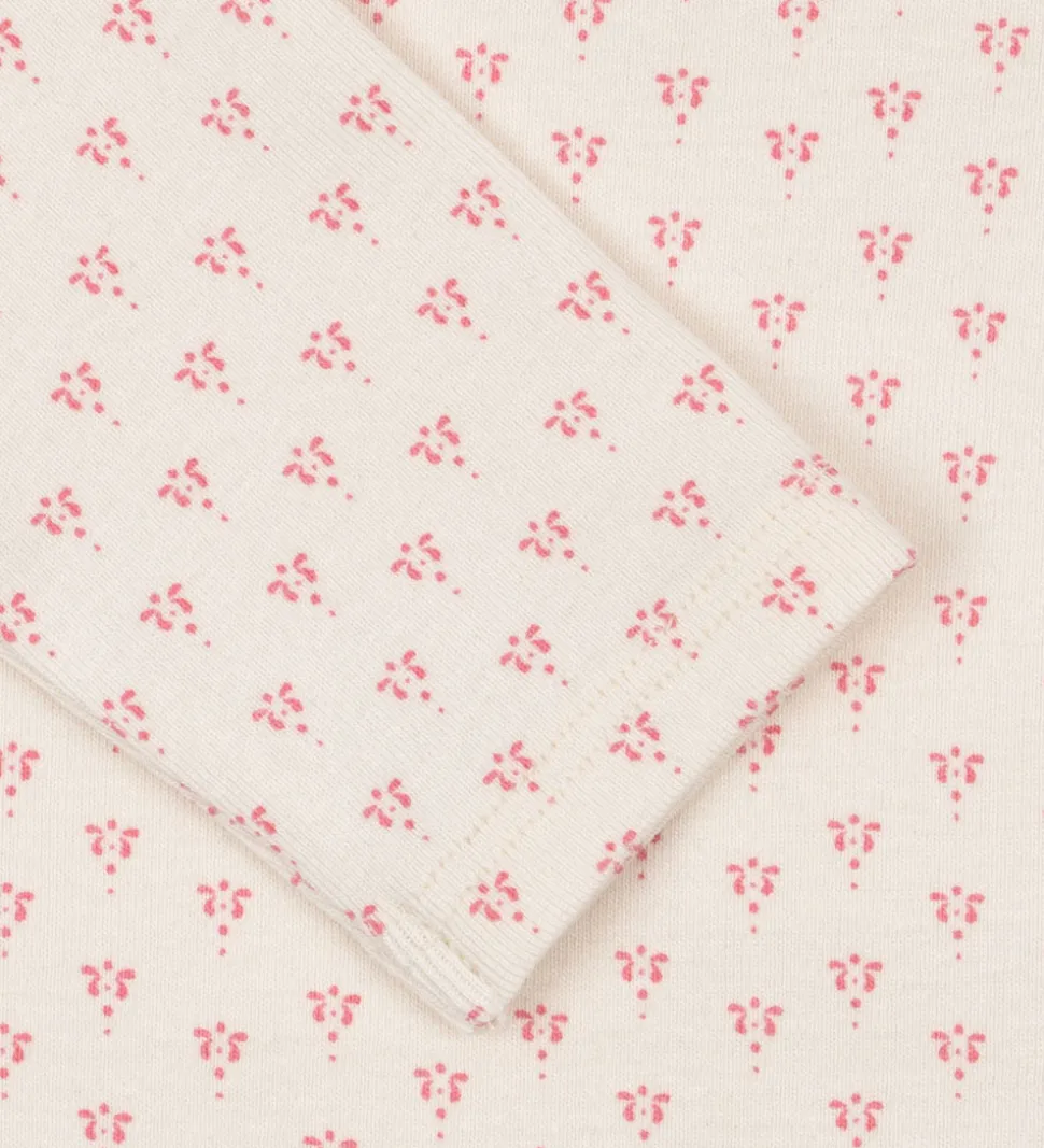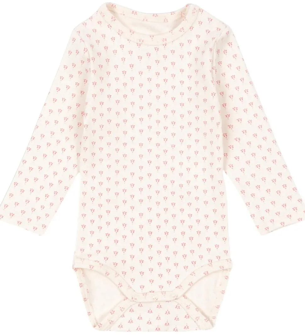 Elegant Fanga Fontana body i cremehvid med et fint mønster af små, rosa motiver. Designet er simpelt med en rund halsudskæring og lange ærmer. Denne body har en praktisk trykknaplukning forneden og ved skulderen, som gør påklædning nem og hurtig.
