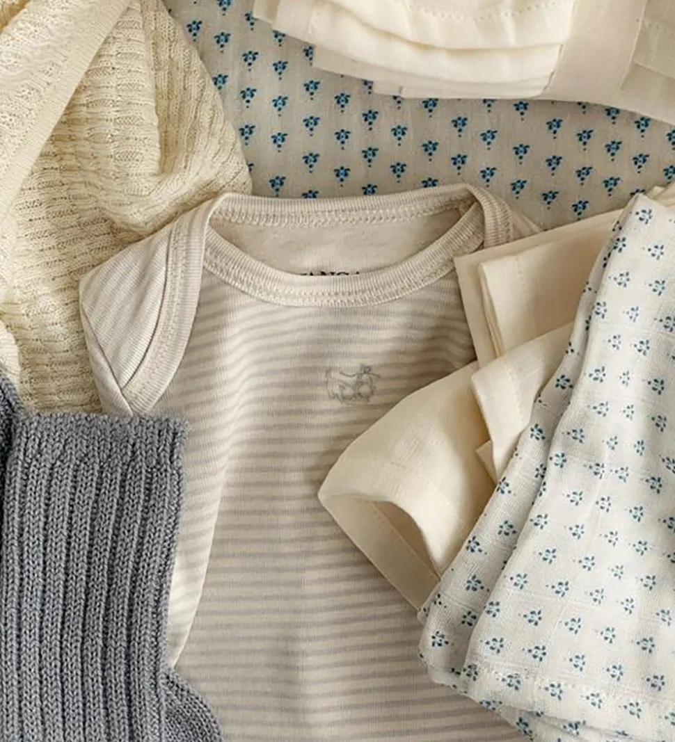 Bløde Fanga Fontana bodyer med lange ærmer solgt i en 3-pak. To i cremehvid med et lille katteprint på brystet, og en med et stribet mønster i cremehvid og lyseblå.