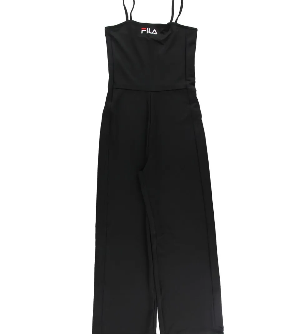 Smart Fila buksedragt i ensfarvet sort i en sporty polyester-kvalitet. Fortil står der “Fila” broderet i hvid og rød.