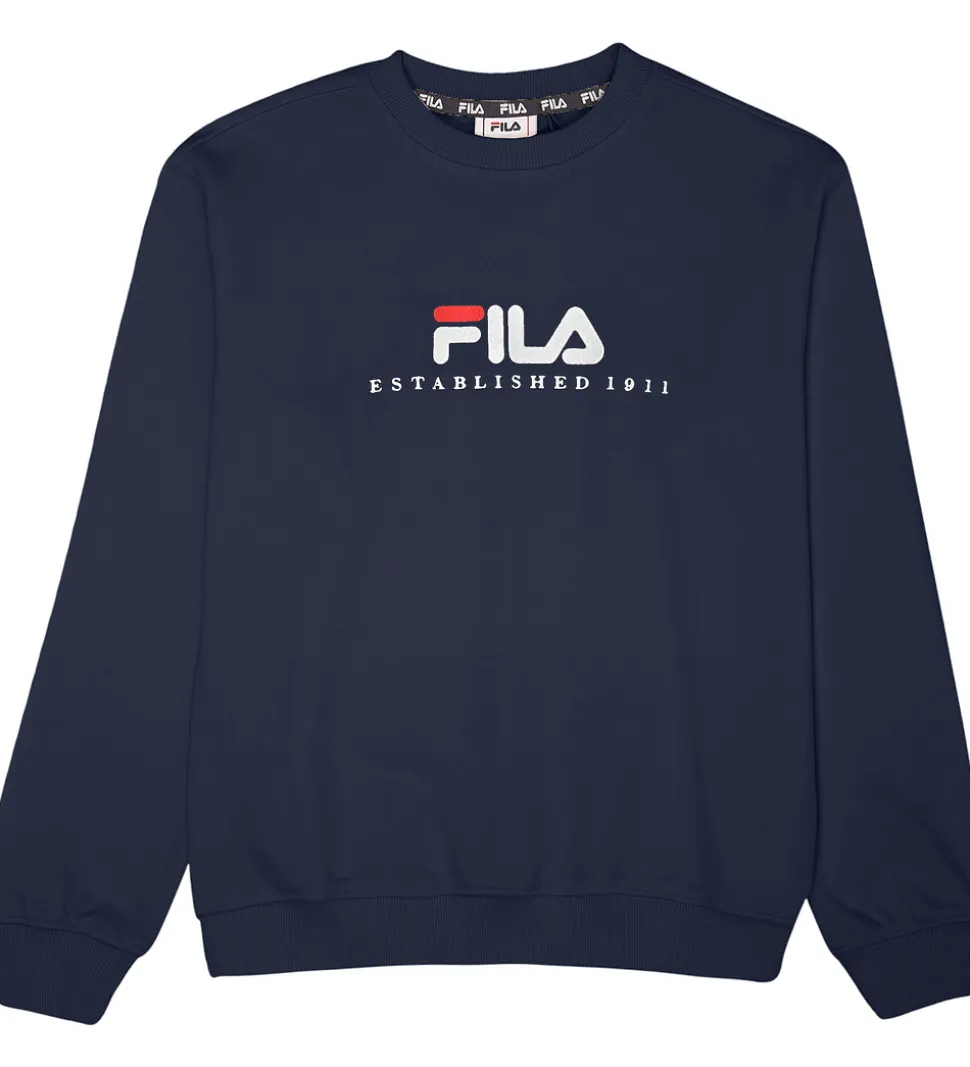 Stilren Fila sweatshirt i en klassisk, navyblå nuance med det ikoniske Fila-logo broderet på fronten. Sweatshirten har teksten “Established 1911” under logoet. Fila sweatshirten er designet med rund hals og ribkanter ved håndleddene og taljen.