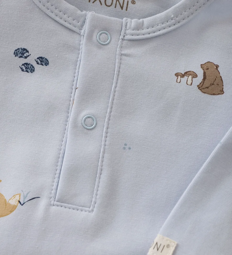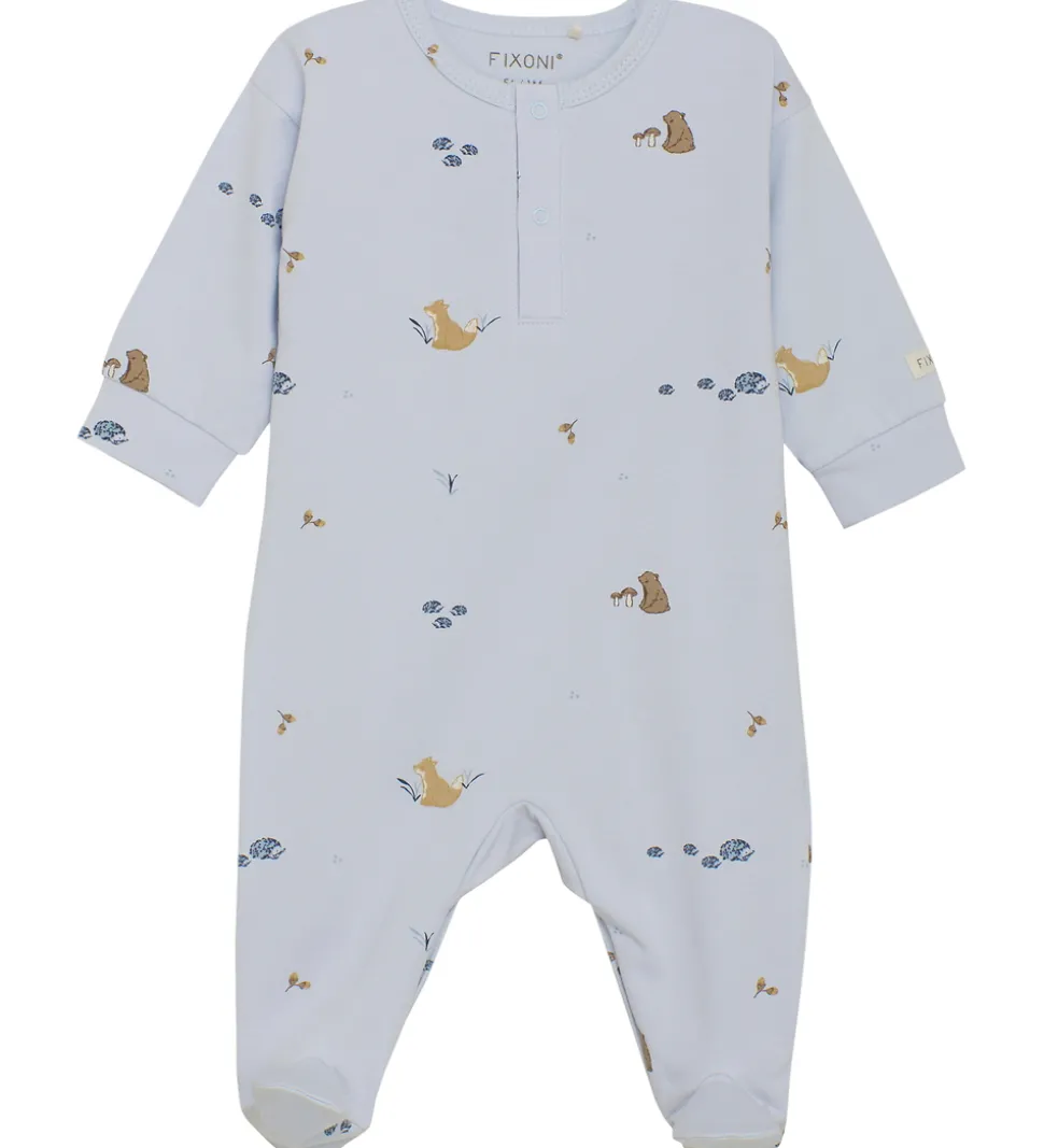 Behagelig Fixoni heldragt i en lyseblå nuance med et blidt dyreprint. Fixoni heldragten har lange ærmer og ben med faste fødder. Den åbnes nemt foran med trykknapper og mellem benene, hvilket gør den praktisk ved påklædning.