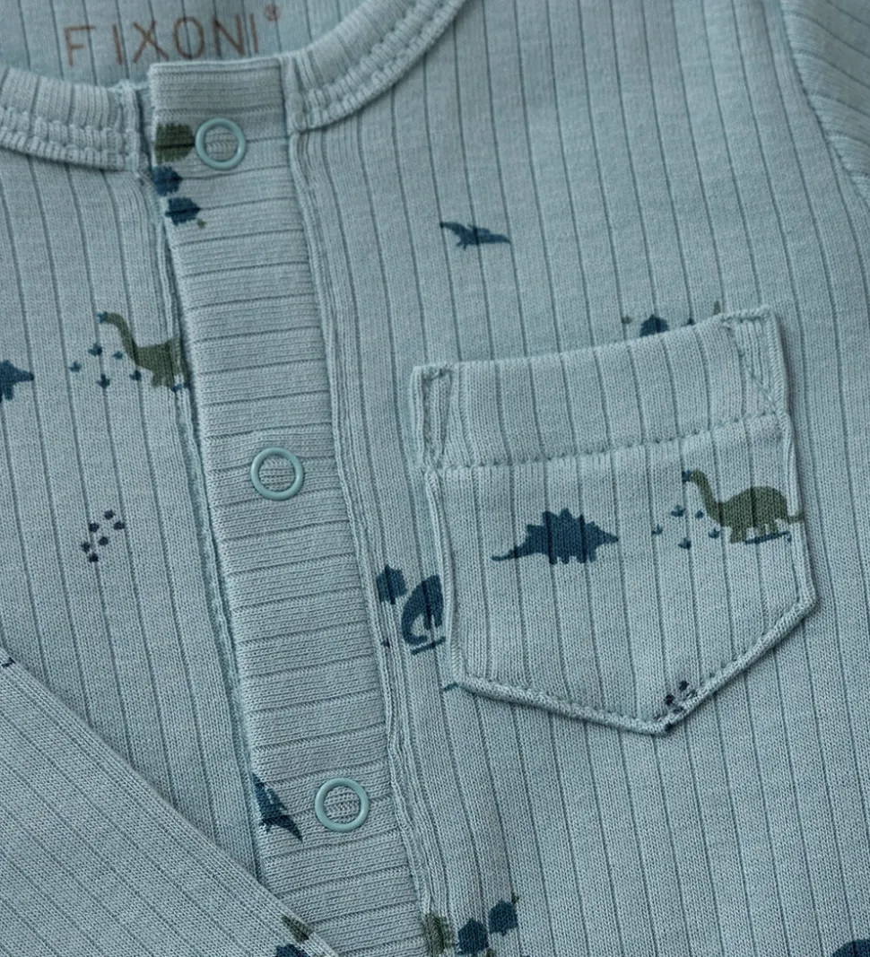 Dejlig Fixoni heldragt i støvet blå med et charmerende dinosaurprint og ribstruktur.