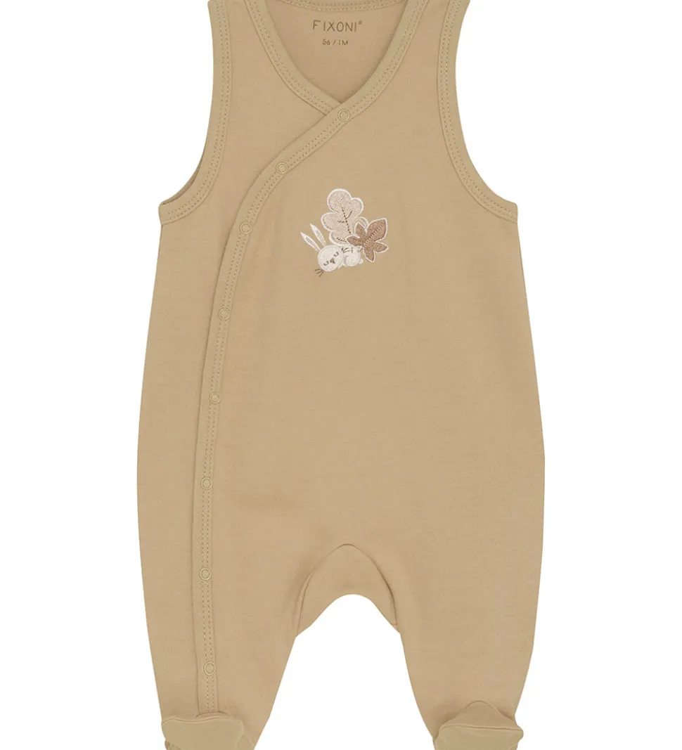 Lækker Fixoni sparkedragt og body. Sparkedragten er lysebrun med med et broderi fortil med en sovende kanin og efterårsblade i hvid og brune nuancer, og bodyen er hvid med et alloverpint med brune blade.