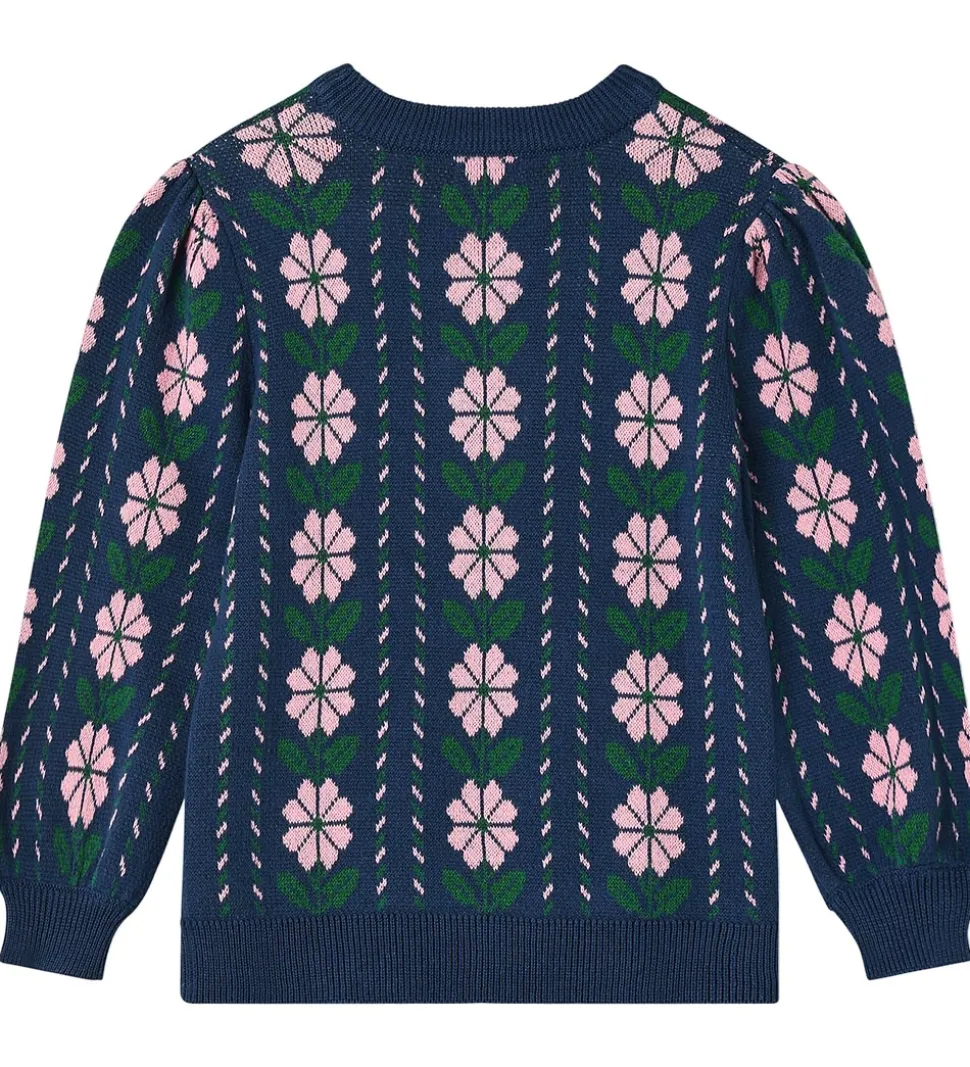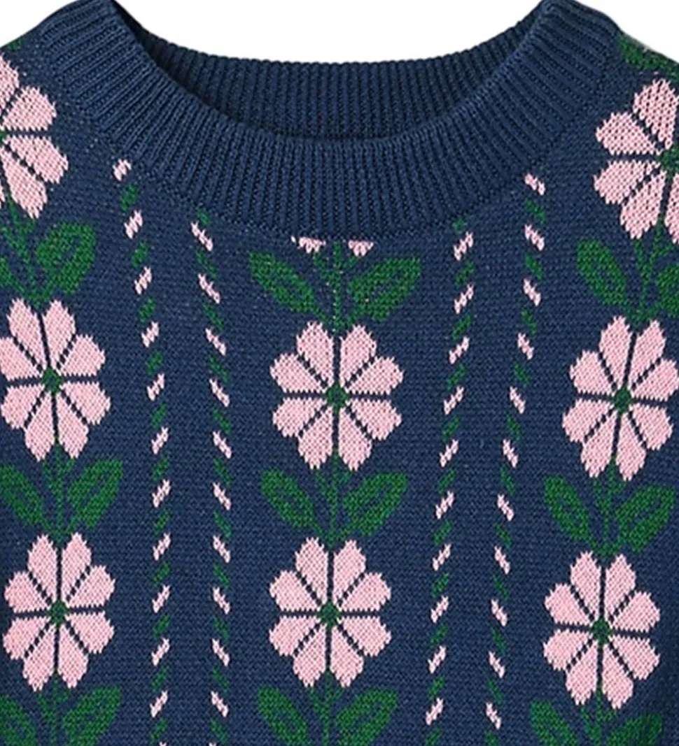 Charmerende Fliink bluse i mørkeblå med blomsterprint i rosa og grøn. Blusen har strikket struktur med ribkanter. Den har en rund halsudskæring og lange ærmer med rynker ved skuldrene.