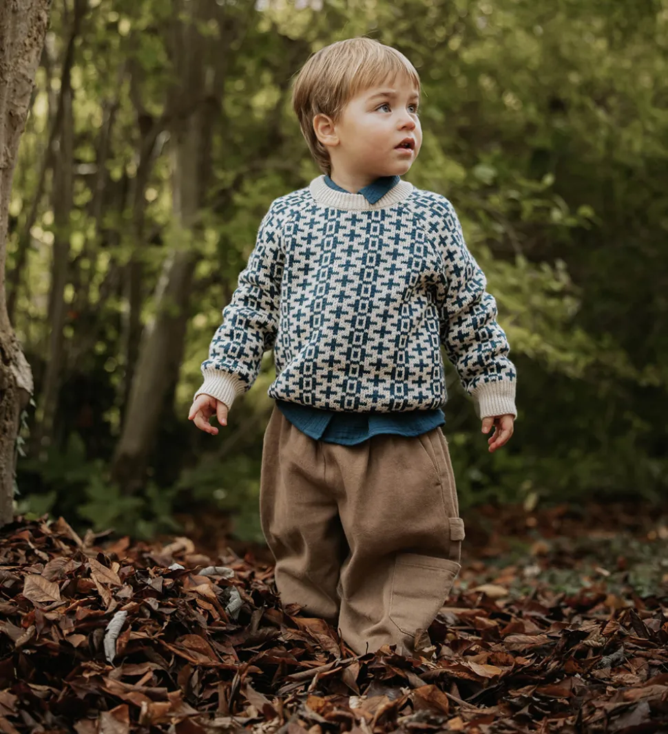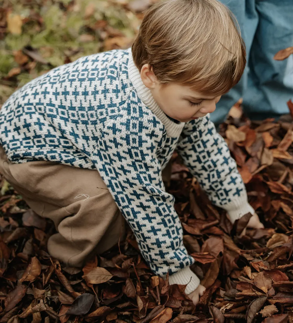 Flot Fliink bluse i lys beige med mørkeblåt mønster. Blusen har en rund halsudskæring og lange ærmer med ribkanter.