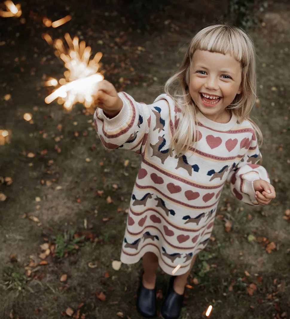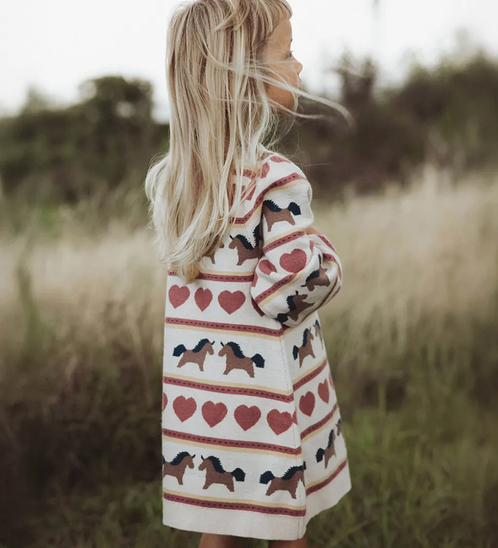 Fin Fliink kjole i beige med et mønster af hjerter og heste i rosa, brune og blå nuancer. Fliink kjolen har en rund halsudskæring og lange ærmer med rynker ved skuldrene. Den er fremstillet i en meget blød kvalitet.