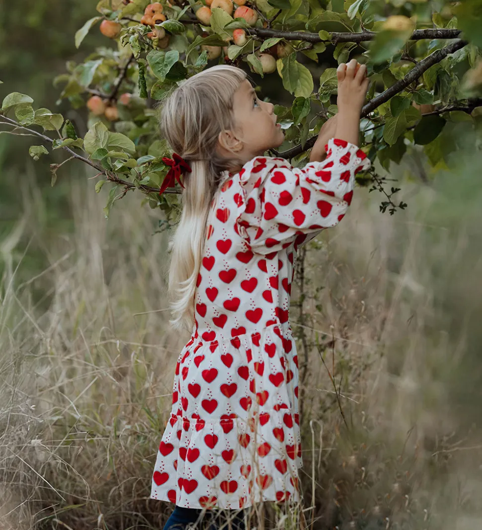 Elegant Fliink kjole i råhvid bæk og bølge med hjerteprint i rød. Kjolen har en rund, elastisk halsudskæring og lange ærmer med flæseafslutning. Ved skuldrene er der flæsedetaljer, og kjolen har god vidde i skørtet.