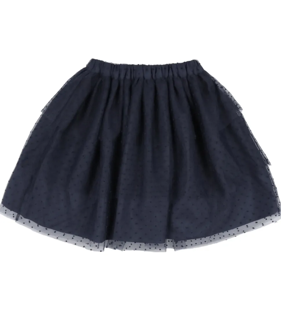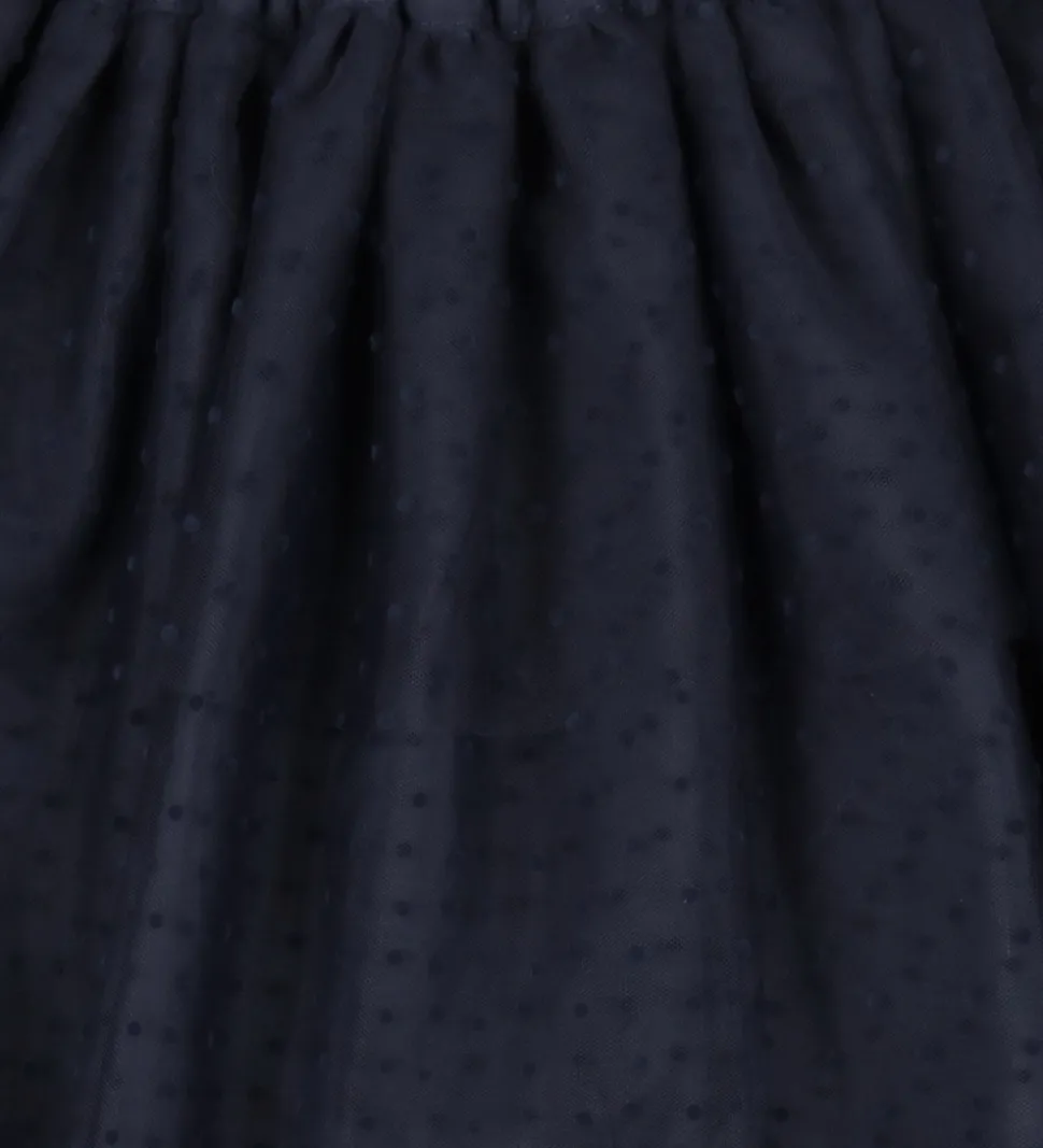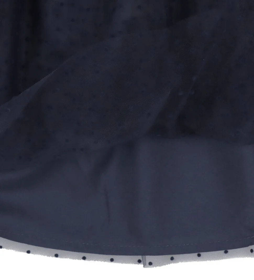 Elegant Fliink nederdel i mørkeblå med et gennemsigtigt lag prikket tyl. Fliink nederdelen har en elastisk talje. Passer perfekt til forskellige anledninger.