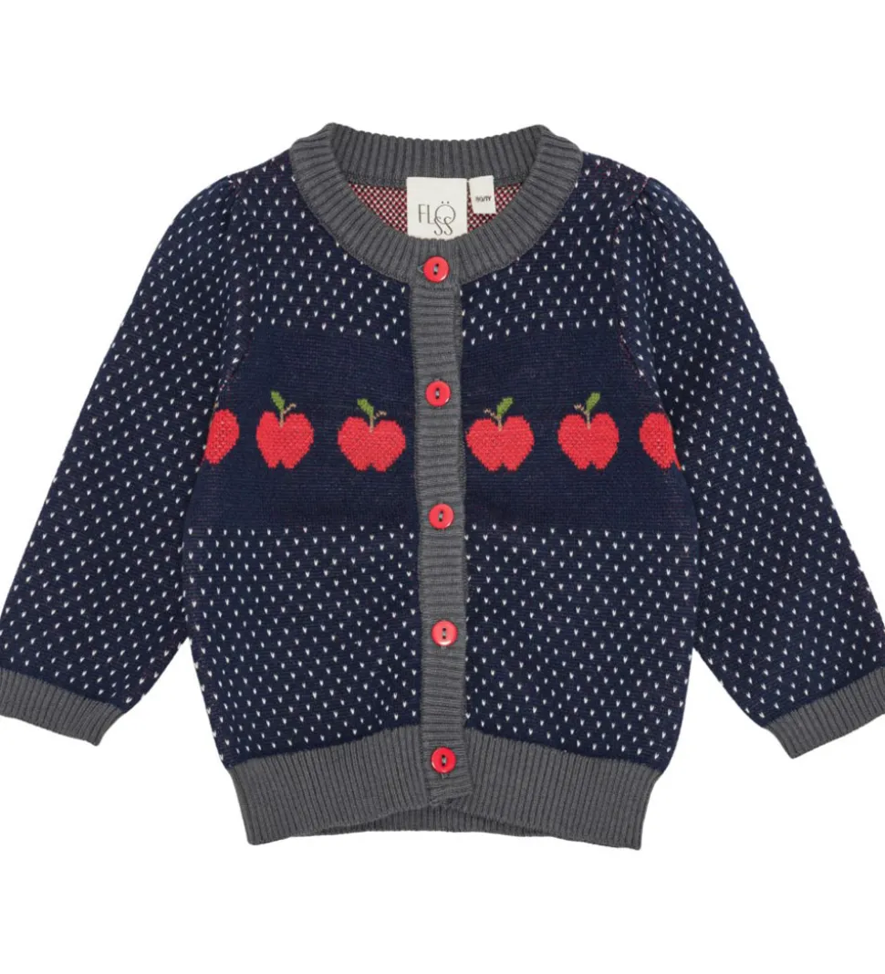 Charmerende Flöss cardigan i mørkeblå strik med små, hvide prikker, der giver et elegant look. Foran pryder en række røde æbler, der tilfører liv til designet.