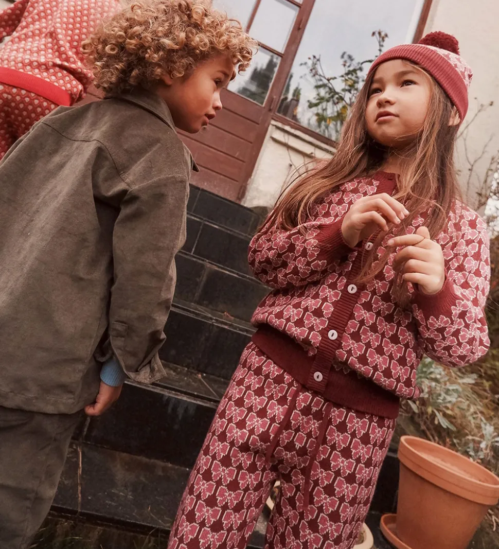 Flot Flöss cardigan i en dyb bordeauxrød med et flot mønster af lyserøde sløjfer.