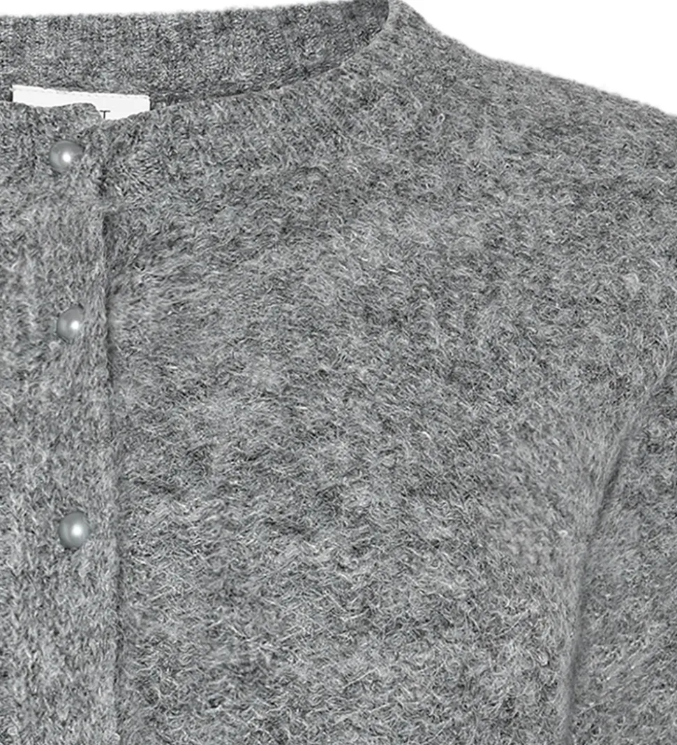 Flot Grunt cardigan i grå strik. Cardiganen har en gennemgående knaplukning fortil og korte ærmer.