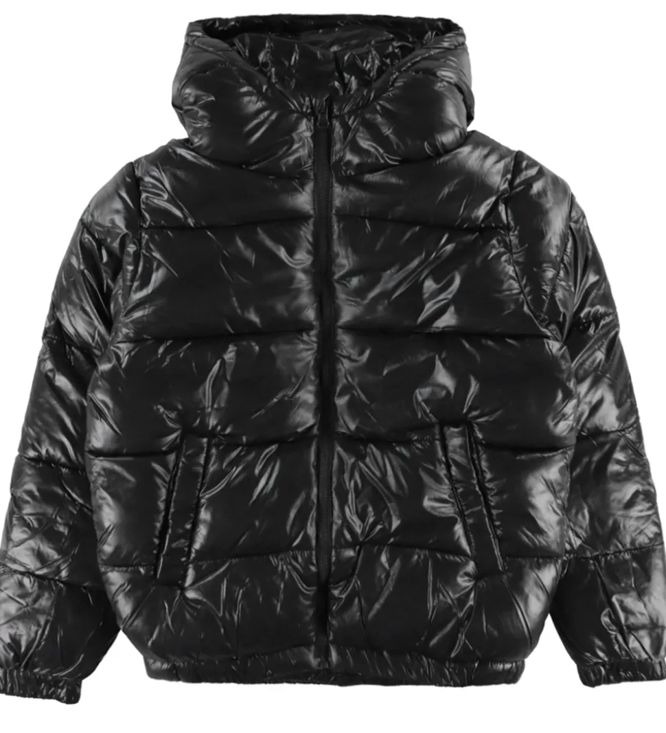 Elegant Grunt dynejakke i en blank, sort farve. De vandrette syninger tilføjer ekstra visuel dybde, som fremhæver stoffets struktur.