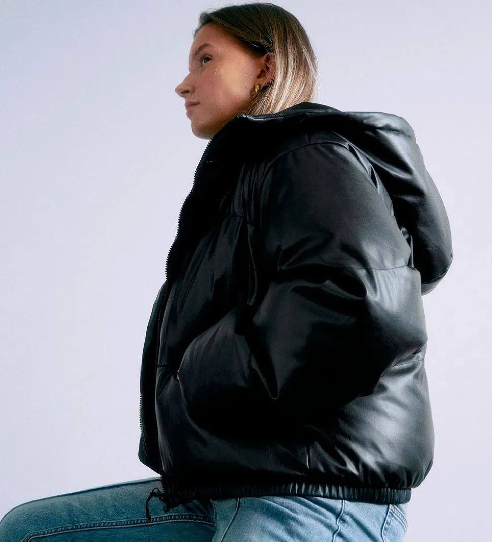 Elegant Grunt dynejakke i sort, imiteret læder af PU. De vandrette syninger giver et klassisk udseende. Dunjakken er udstyret med en rummelig hætte og har en gennemgående lynlås fortil for nem åbning og lukning.