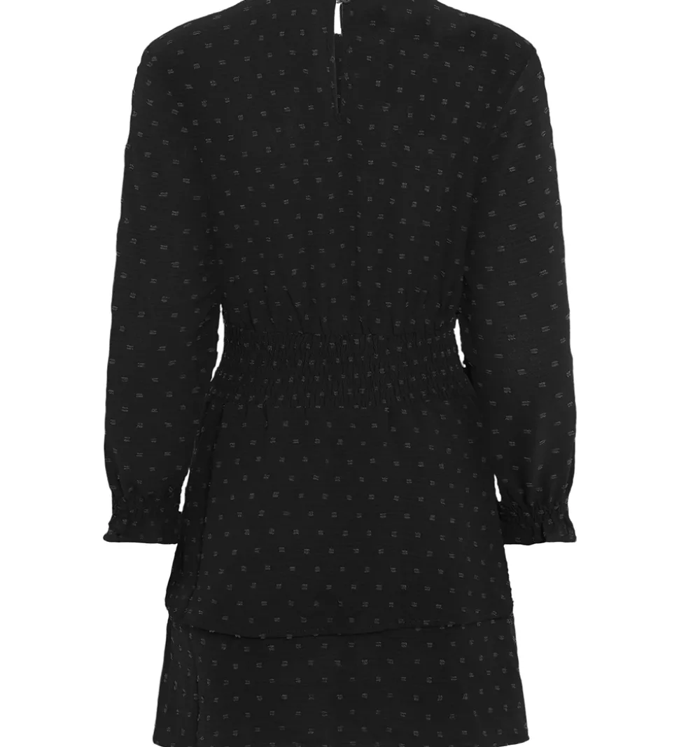 Fin Grunt kjole i sort med små, diskrete prikker. Grunt kjolen har en rund halsudskæring med en knap i nakken. Den har lange ærmer med flæseafslutning og en smockdetalje i taljen. Nederdelen har to lag i froskellige længder, som giver en flot effekt.