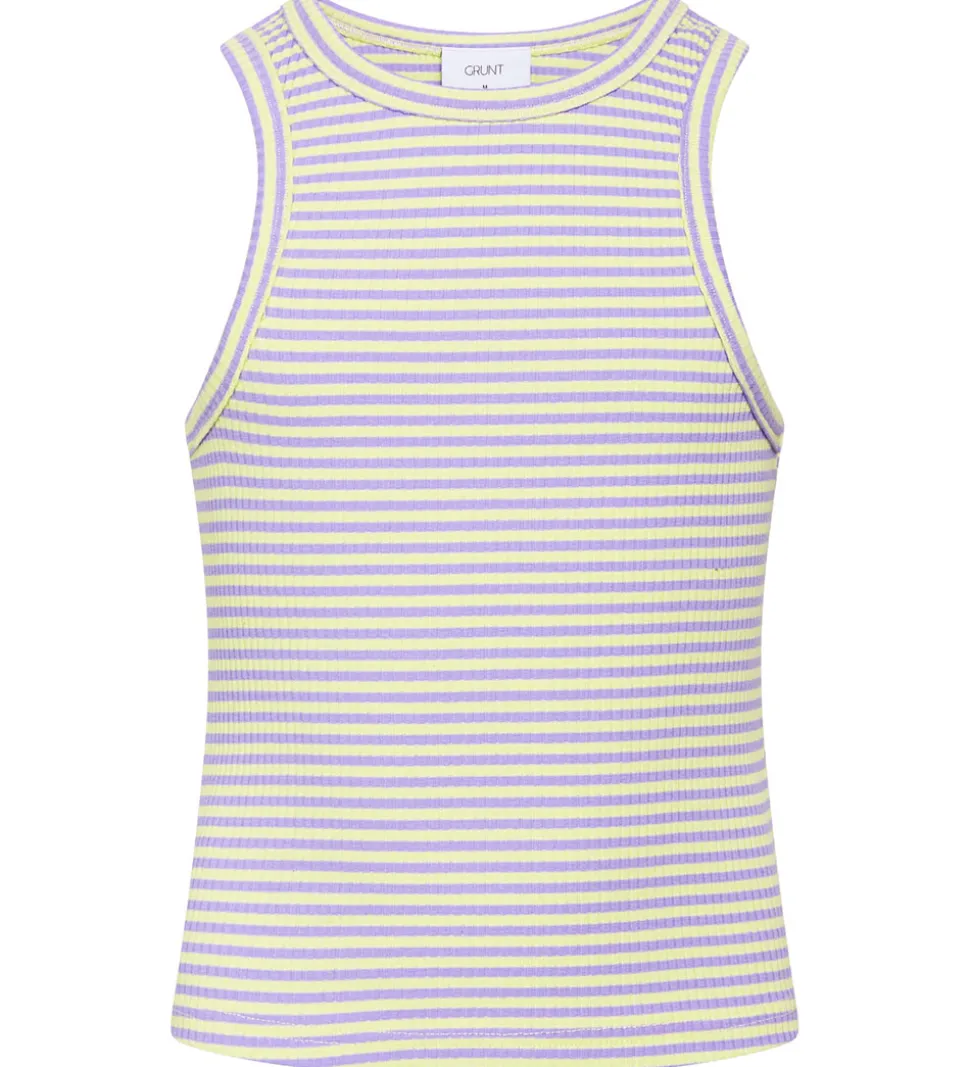 Grunt toppen er uden ærmer og den har brede skulderstropper. I arm- og halsåbningerne er der brede ribkanter, og toppen er i en blød og strækbar bomuldskvalitet.