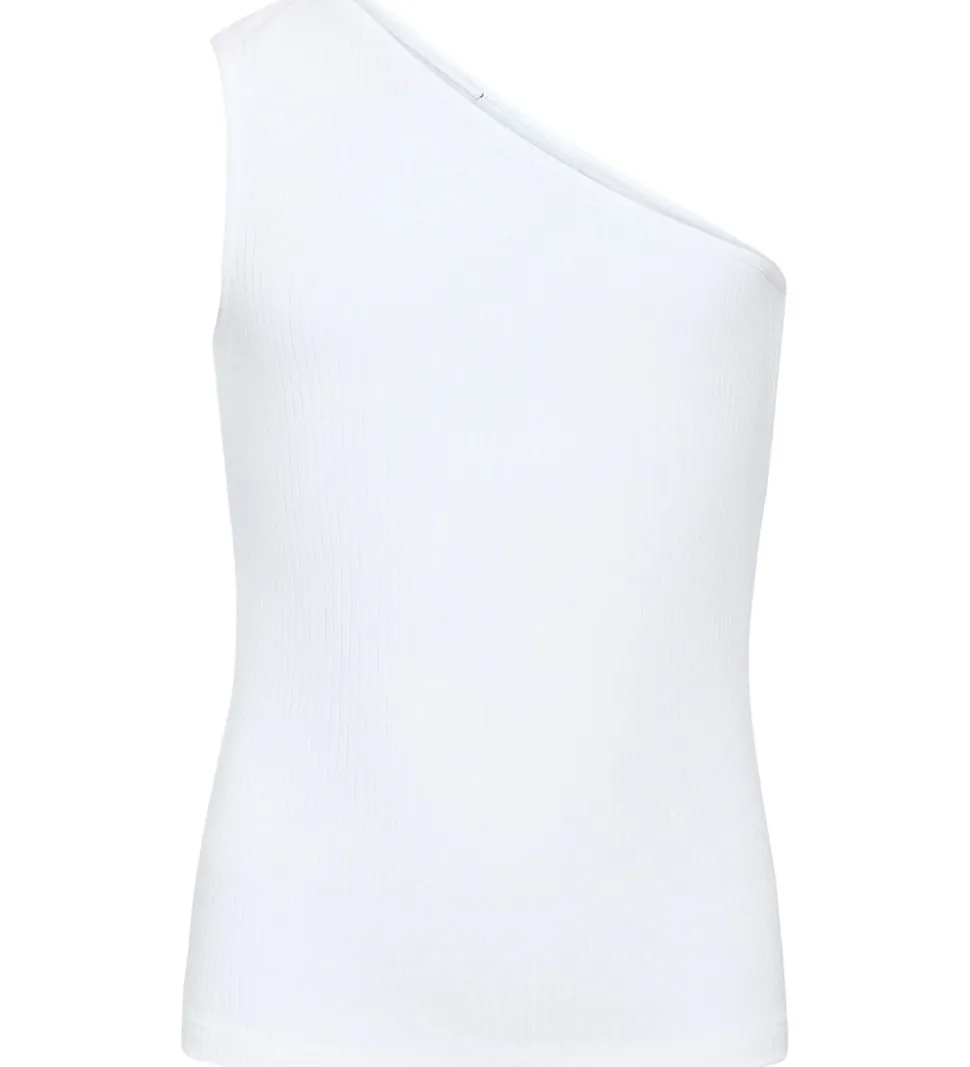 Grunt toppen er uden ærmer og har en bred skulderstrop i højre side. Toppen har et asymmetrisk design med one-shoulder effekt, samt en tætsiddende pasform.