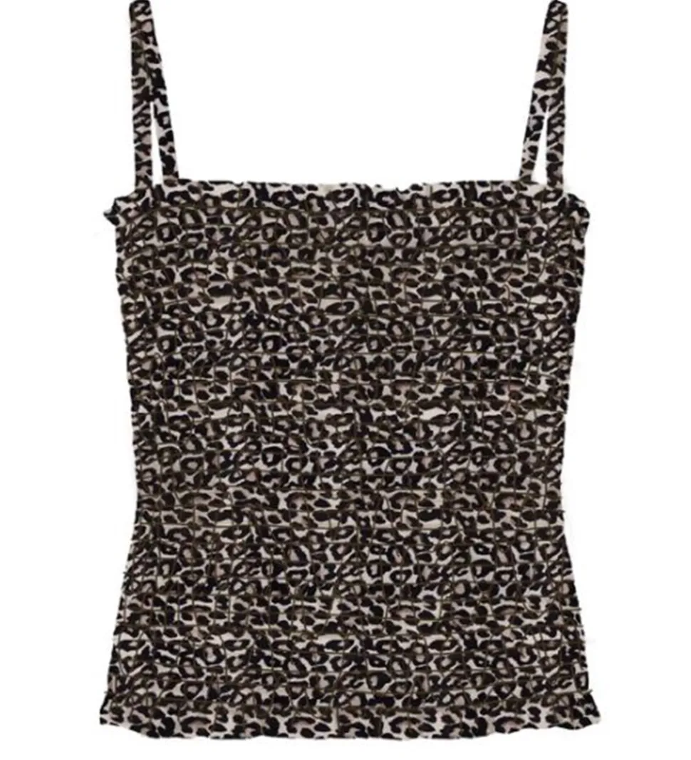 Smart Grunt top i beige med et leopardprint i sort og lysebrun.
