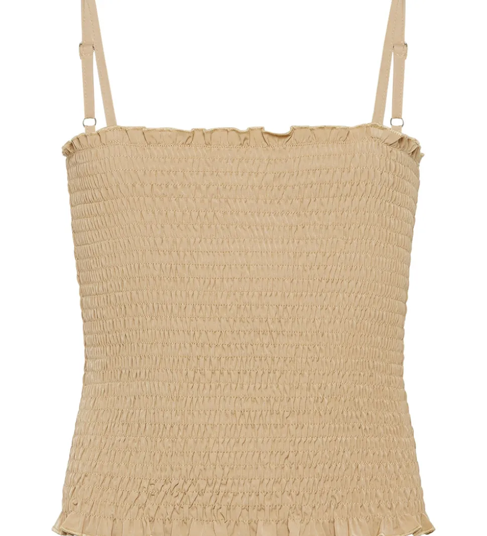 Grunt toppen er uden ærmer og den har smalle, justerbare skulderstropper. Toppen er i en flot smock struktur, og den er produceret i en blød og strækbar kvalitet.