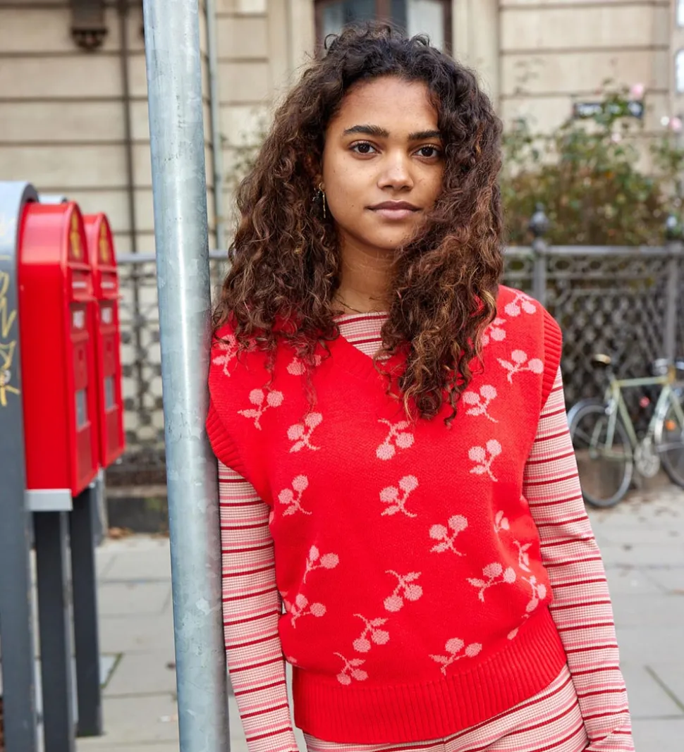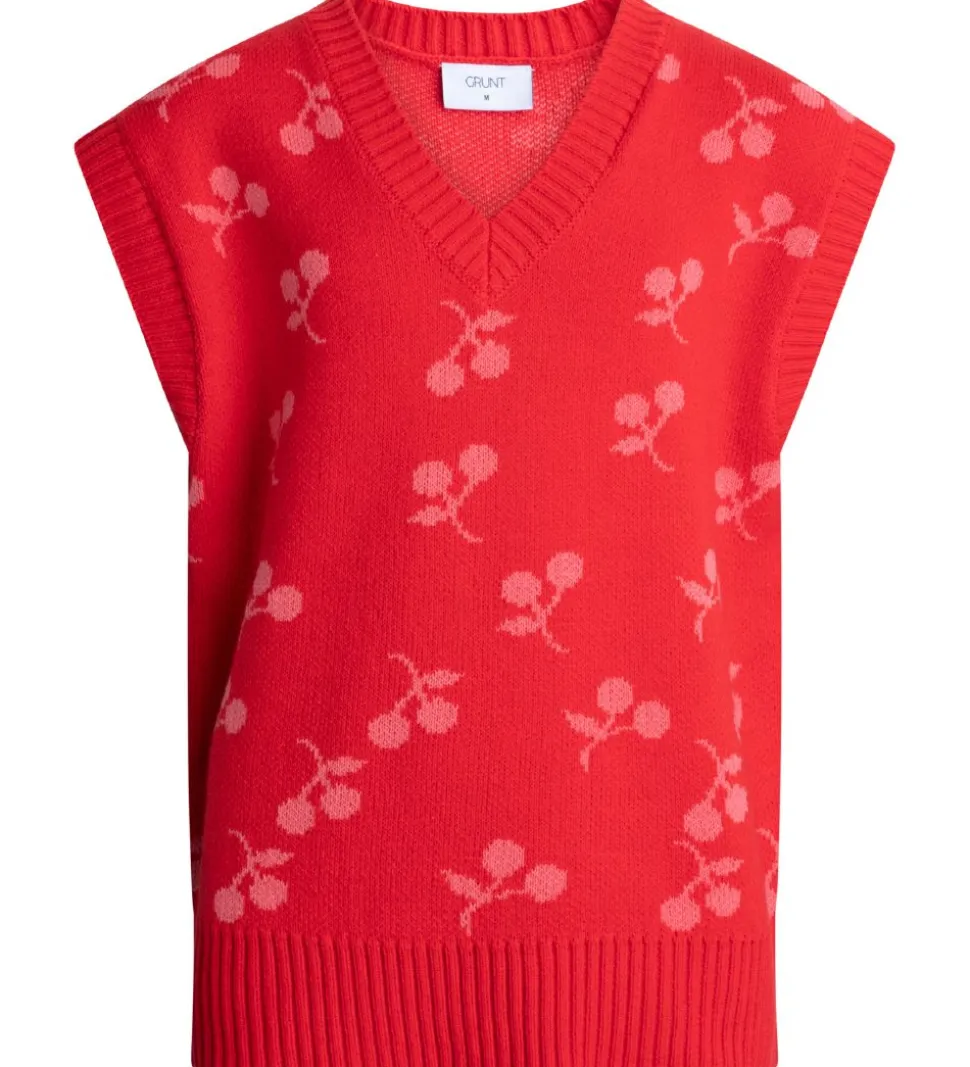 Sød Grunt vest i rød strik med lyserøde kirsebær.