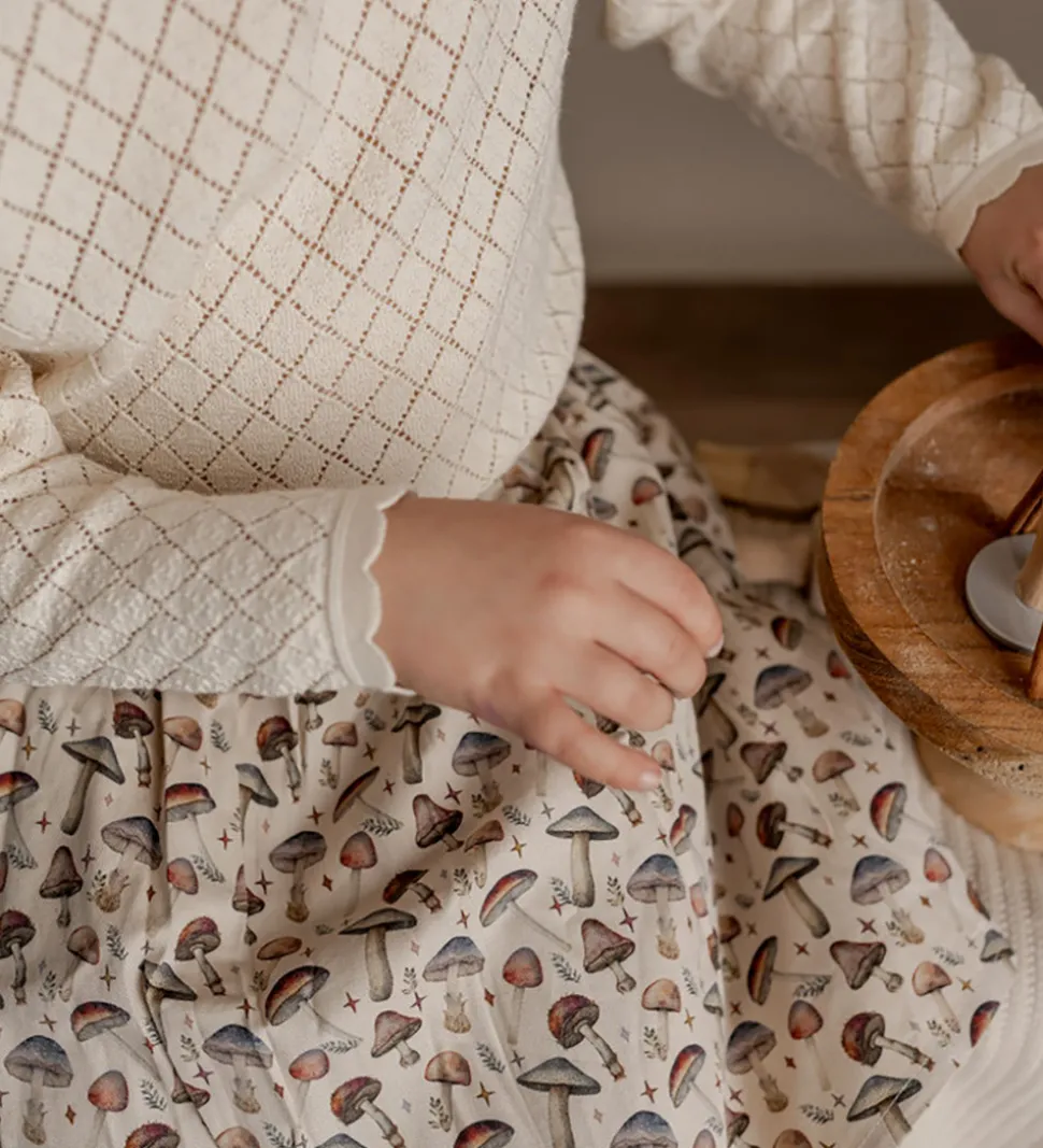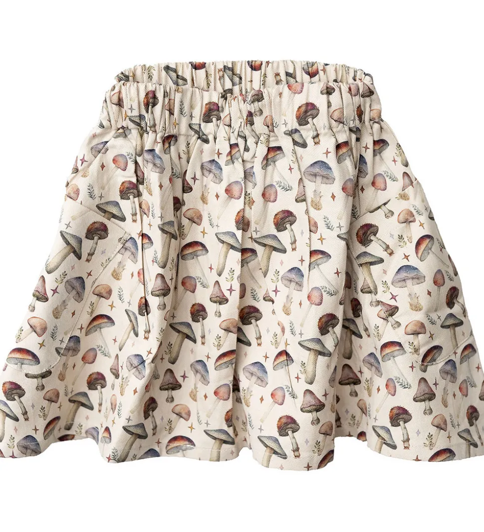 Charmerende Hanevild nederdel i beige med et farverigt, detaljeret svampeprint. Hanevild nederdelen har en elastisk talje, der sikrer en god pasform, og fine lommer på siden. Farverne på nederdelen er dæmpede og naturlige, hvilket giver et stilfuldt udtryk.
