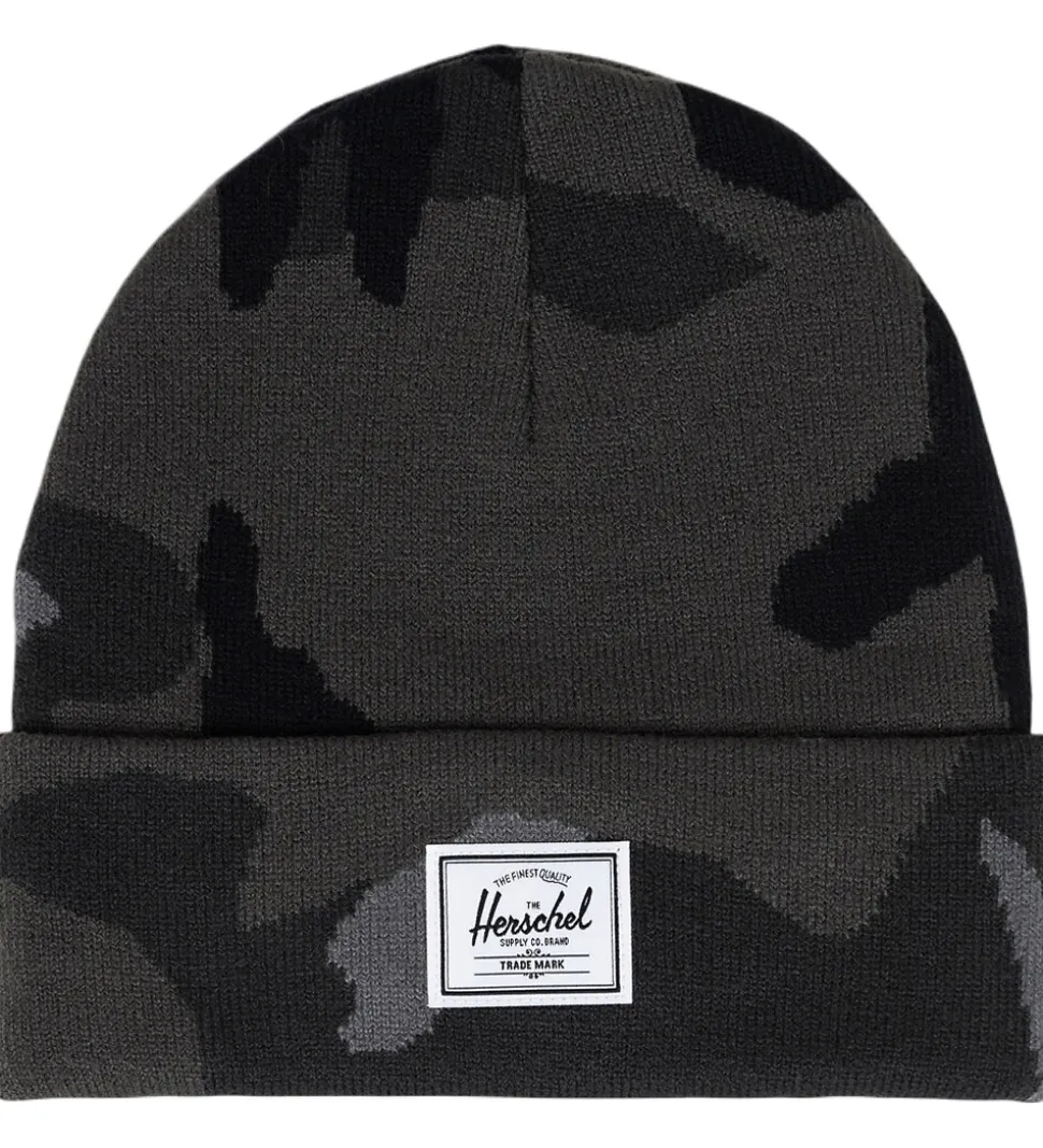 Smart Herschel hue med camouflageprint i sort og grå nuancer. På fronten er der et hvidt logo. Huen består af to lag. Den er fremstillet i en blød, strikket kvalitet med en rund hovedform og et bredt ombuk nederst.