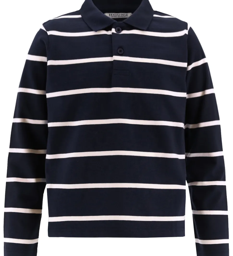 Elegant Hound polo med lange ærmer og et klassisk, tidløst design. Poloen er navy og har brede, horisontale hvide striber, hvilket giver et stilrent udtryk. Hound poloen er forsynet med knapper ved halsåbningen for nem justering.