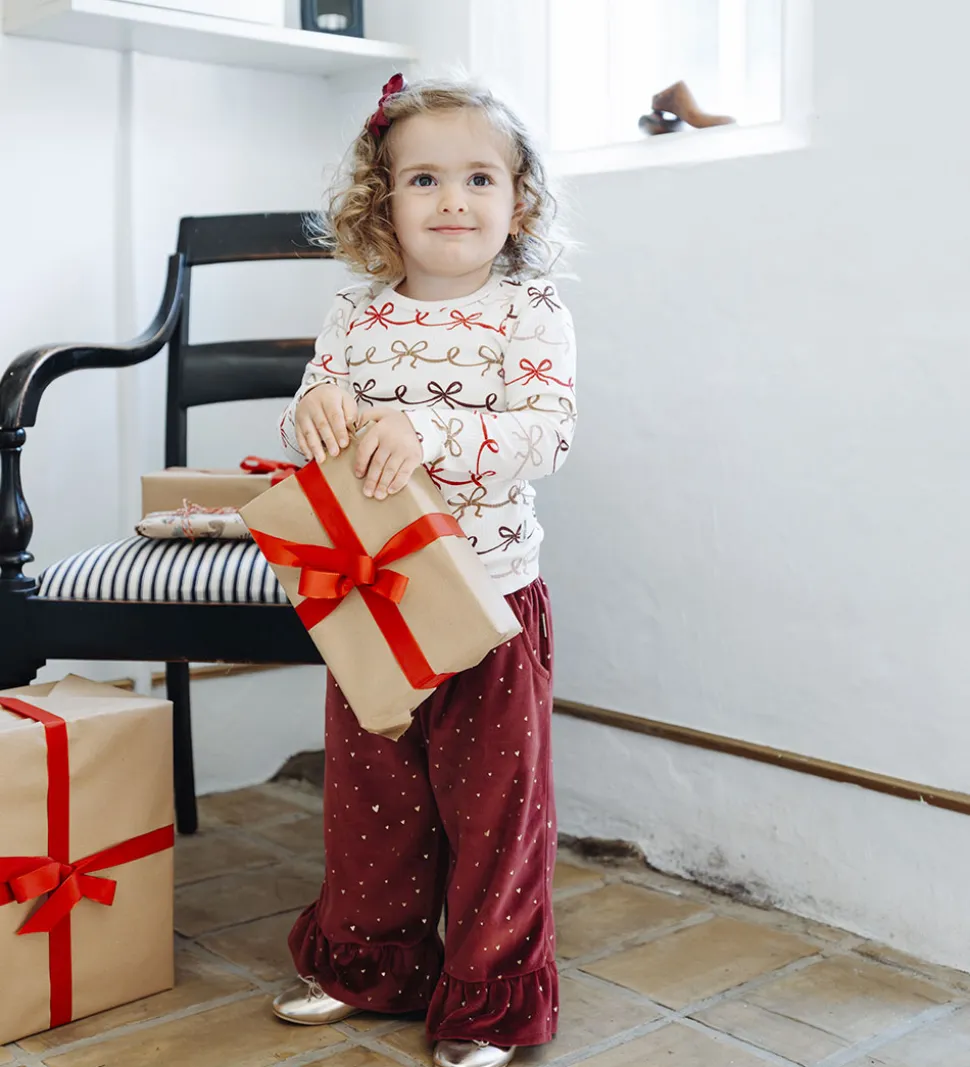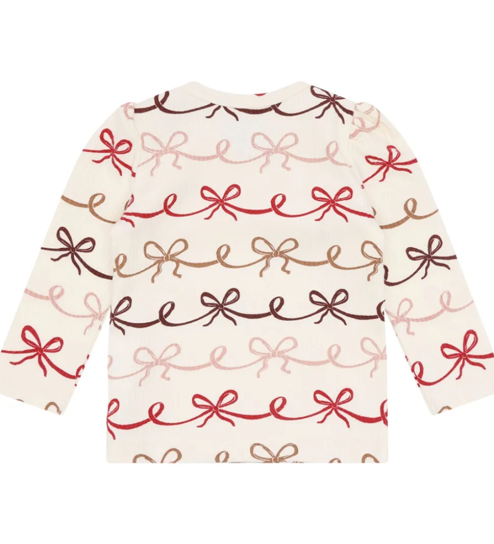 Smuk Hust and Claire bluse i en blød, off-white nuance dekoreret med et charmerende sløjfemønster i forskellige røde og brune toner. Den runde halsudskæring og de lange ærmer bidrager til et klassisk look. Hust and Claire har skabt et stilfuldt design, der både er sødt og tidløst.