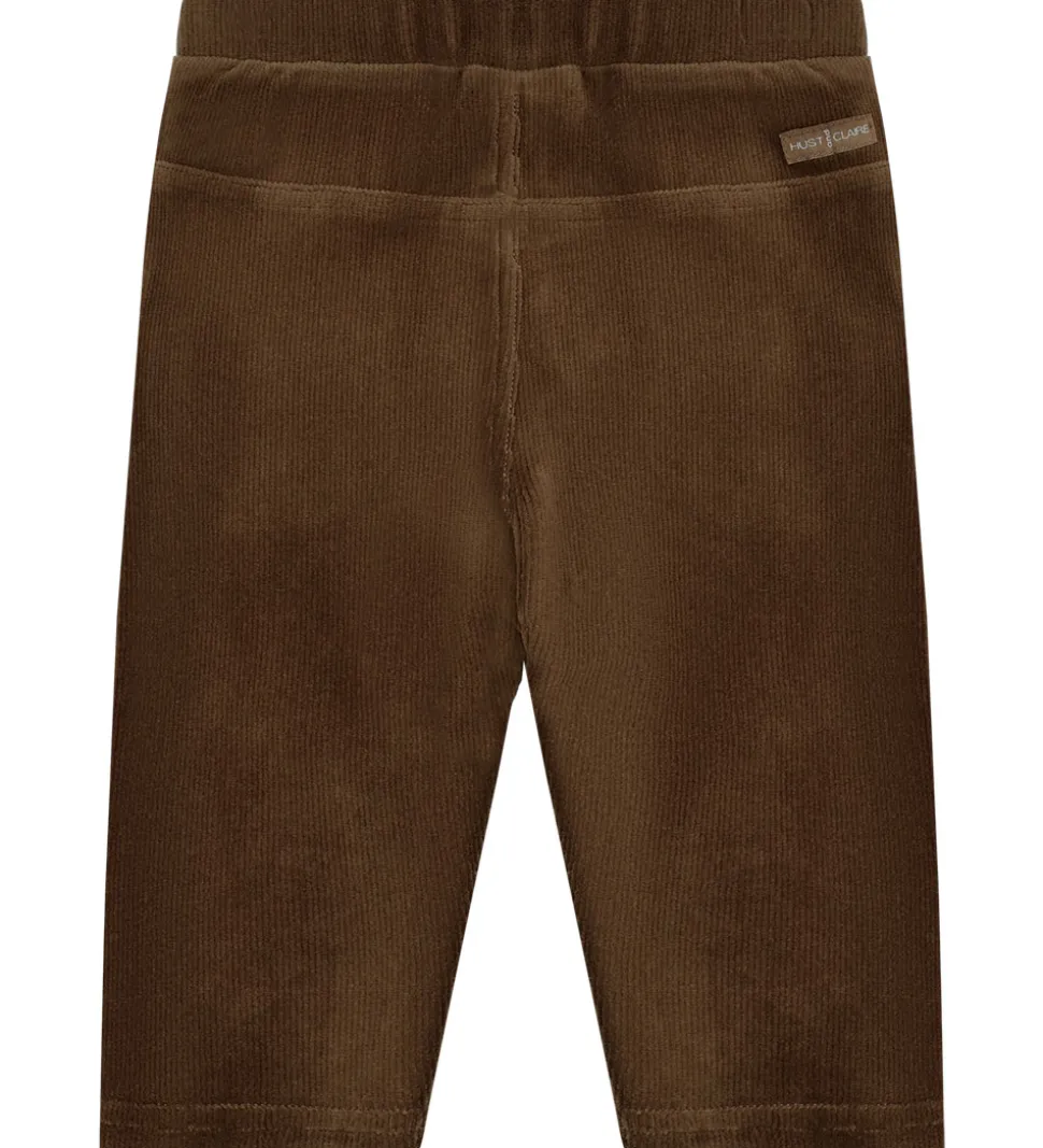 Lækre Hust and Claire fløjlsbukser i ensfarvet brun. Hust and Claire fløjlsbukserne har en justerbar elastikkant i livet for en behagelig pasform. Foran er der to dekorative knapper samt praktiske åbne lommer i siderne.
