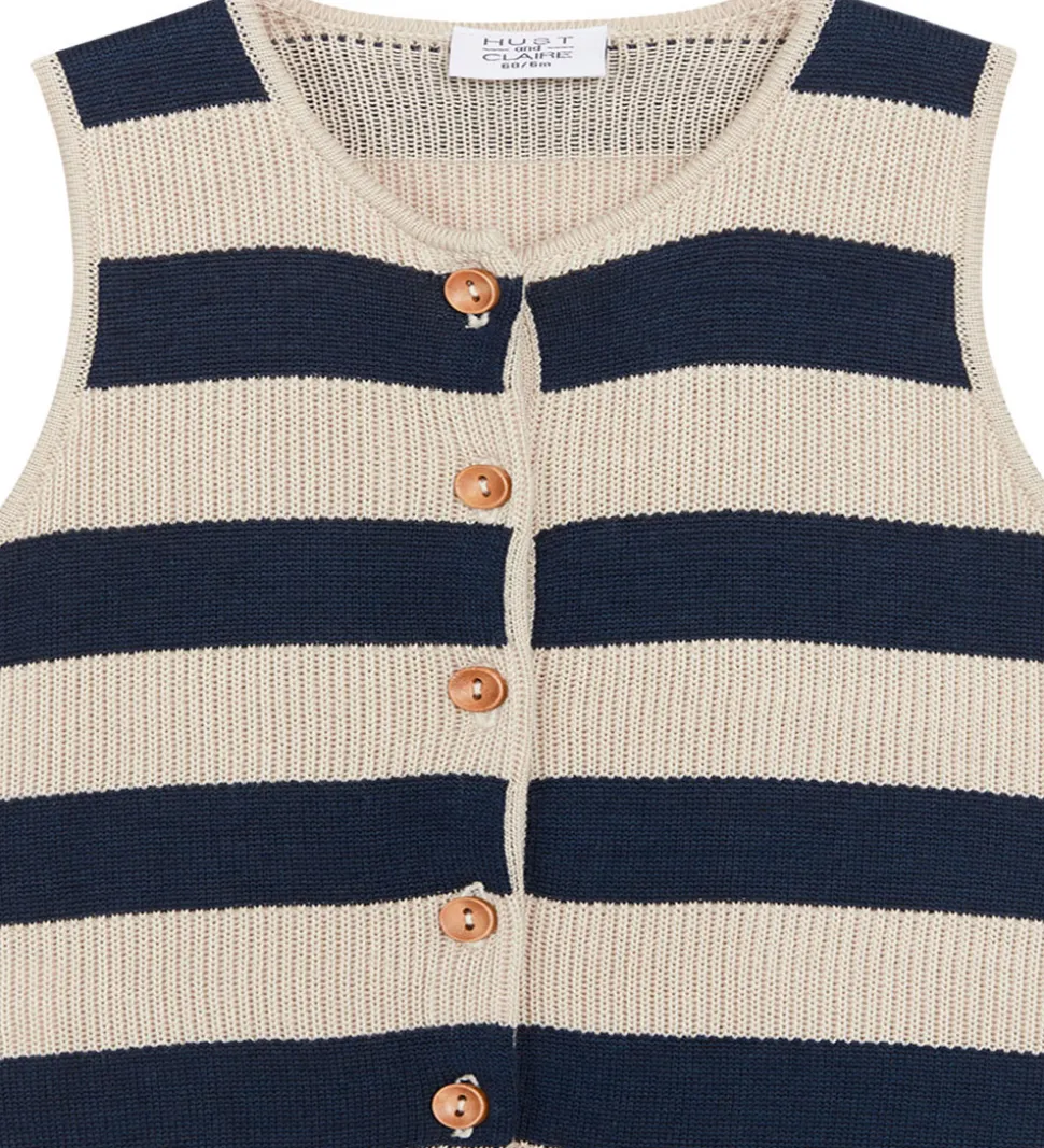 Charmerende Hust and Claire heldragt i et stribet mønster med brede, horisontale striber i beige og mørkeblå nuancer.