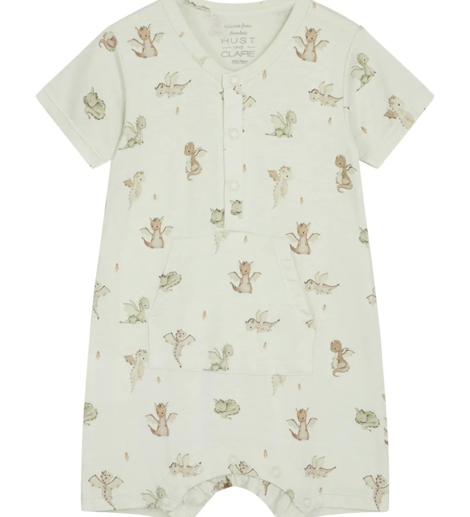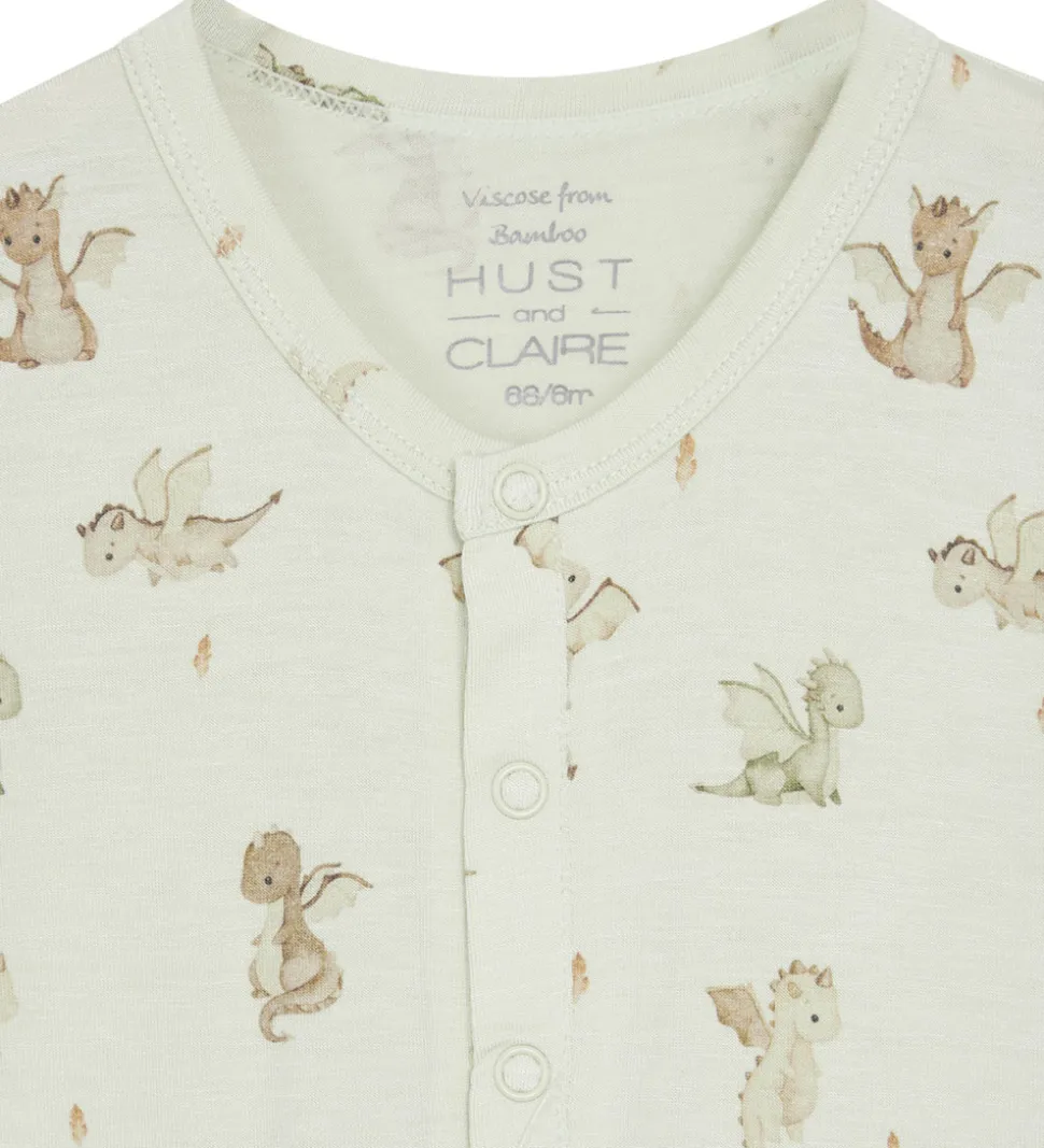 Charmerende Hust and Claire natdragt med korte ærmer, dekoreret med et fint mønster af små drager i grønne og brune nuancer. Natdragten har praktiske trykknapper ved halsudskæringen og en kængurulomme foran.