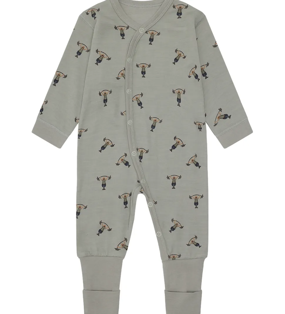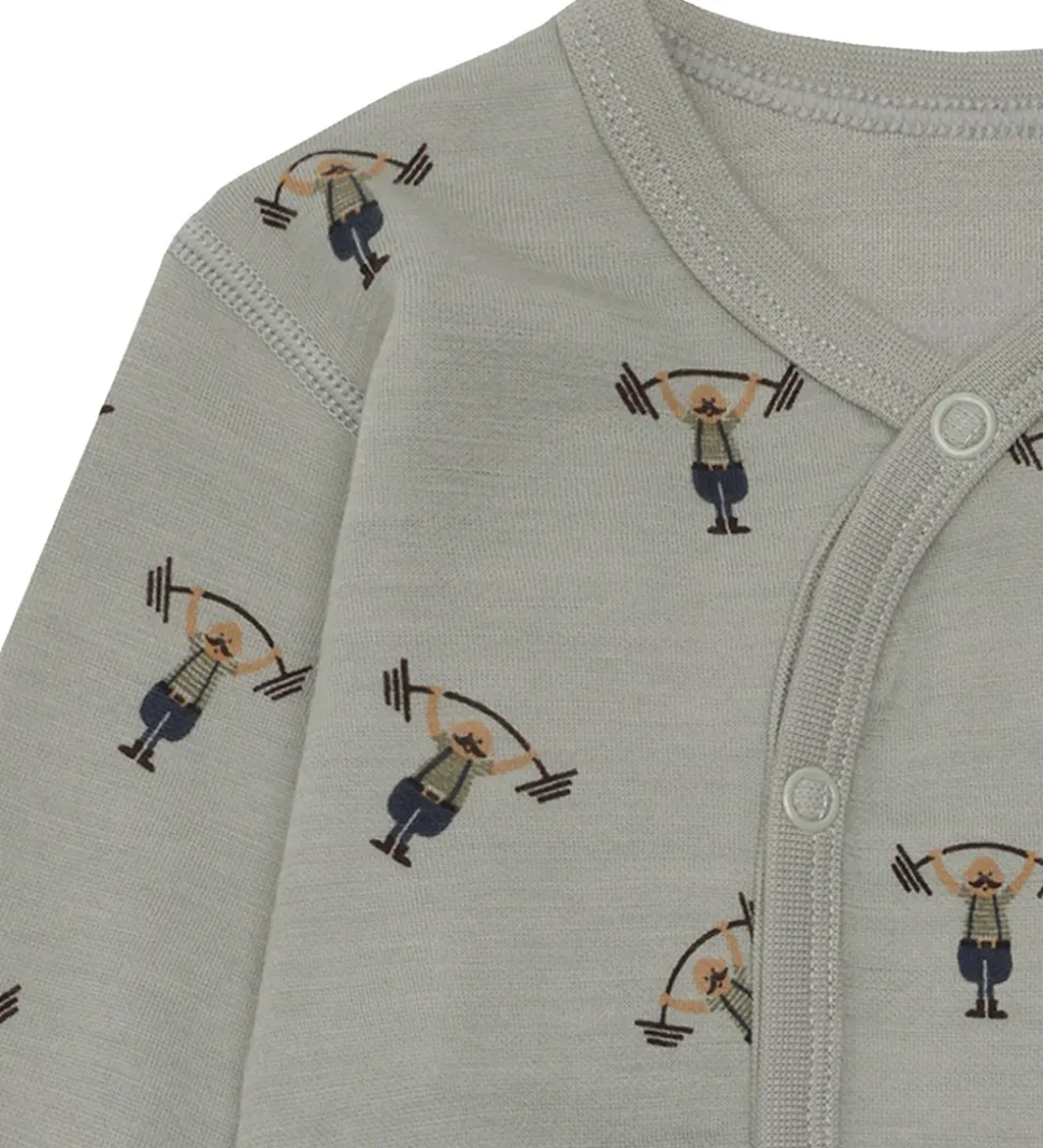Skøn Hust and Claire natdragt i støvet grøn med et alloverprint af vægtløftere. Natdragten har lange ærmer og lukkes foran med praktiske trykknapper fra hagen til venstre fod. Natdragten har lange ben med brede ribkanter og mulighed for ombuk til lukkede fødder. Den er fremstillet i en blød kvalitet af uld og bambus viskose.