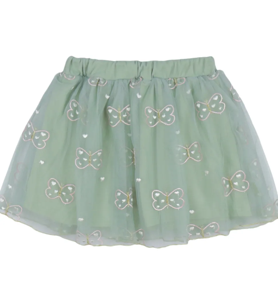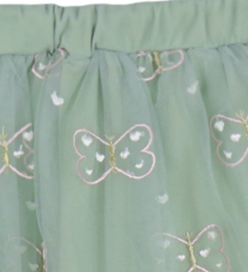 Lækker Hust and Claire nederdel i en smuk pastelgrøn med søde sommerfugle broderet i guld, rosa og hvid, der tilføjer et charmerende touch til designet.
