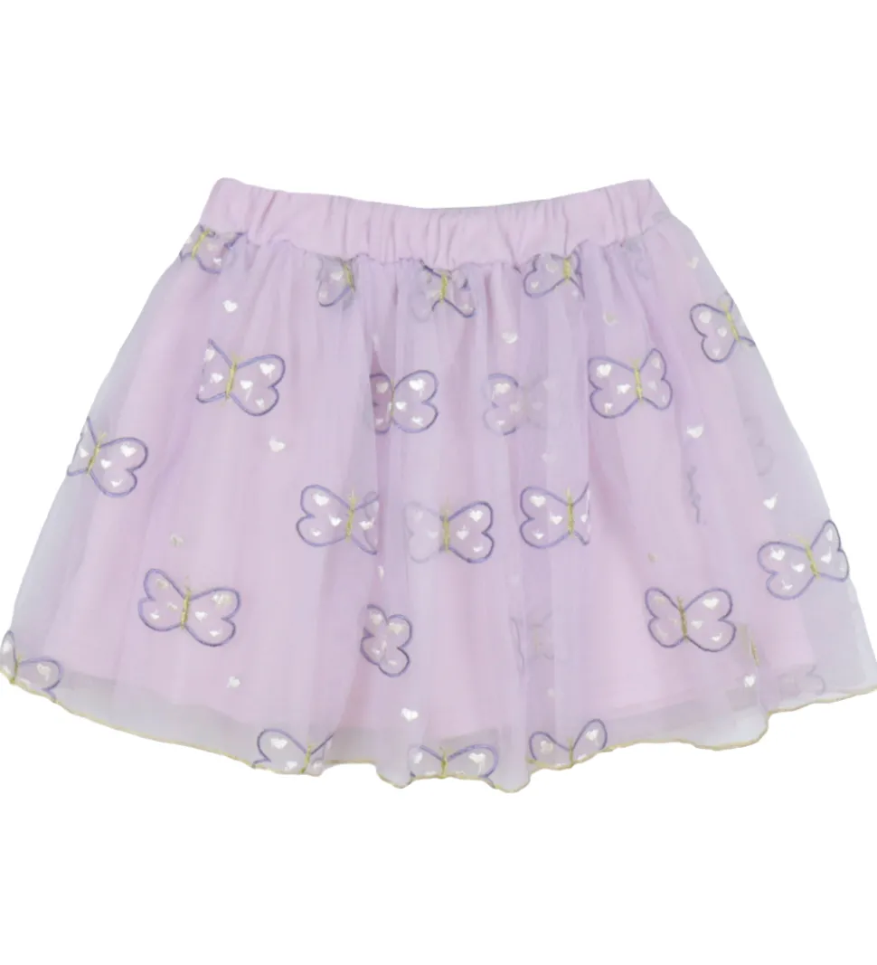 Lækker Hust and Claire nederdel i en lys lilla med fine sommerfugle broderet i guld, lilla og hvid. Denne nederdel er perfekt til leg og hyggelige dage.