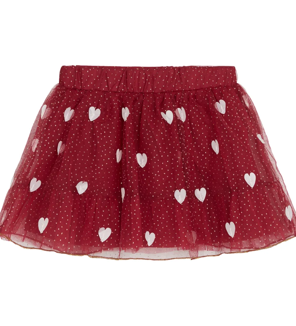 Skøn Hust and Claire nederdel i en rød nuance med hvidt hjerteprint og fine detaljer. Nederdelen har en afslappet pasform og gir et legende udtryk til enhver påklædning.