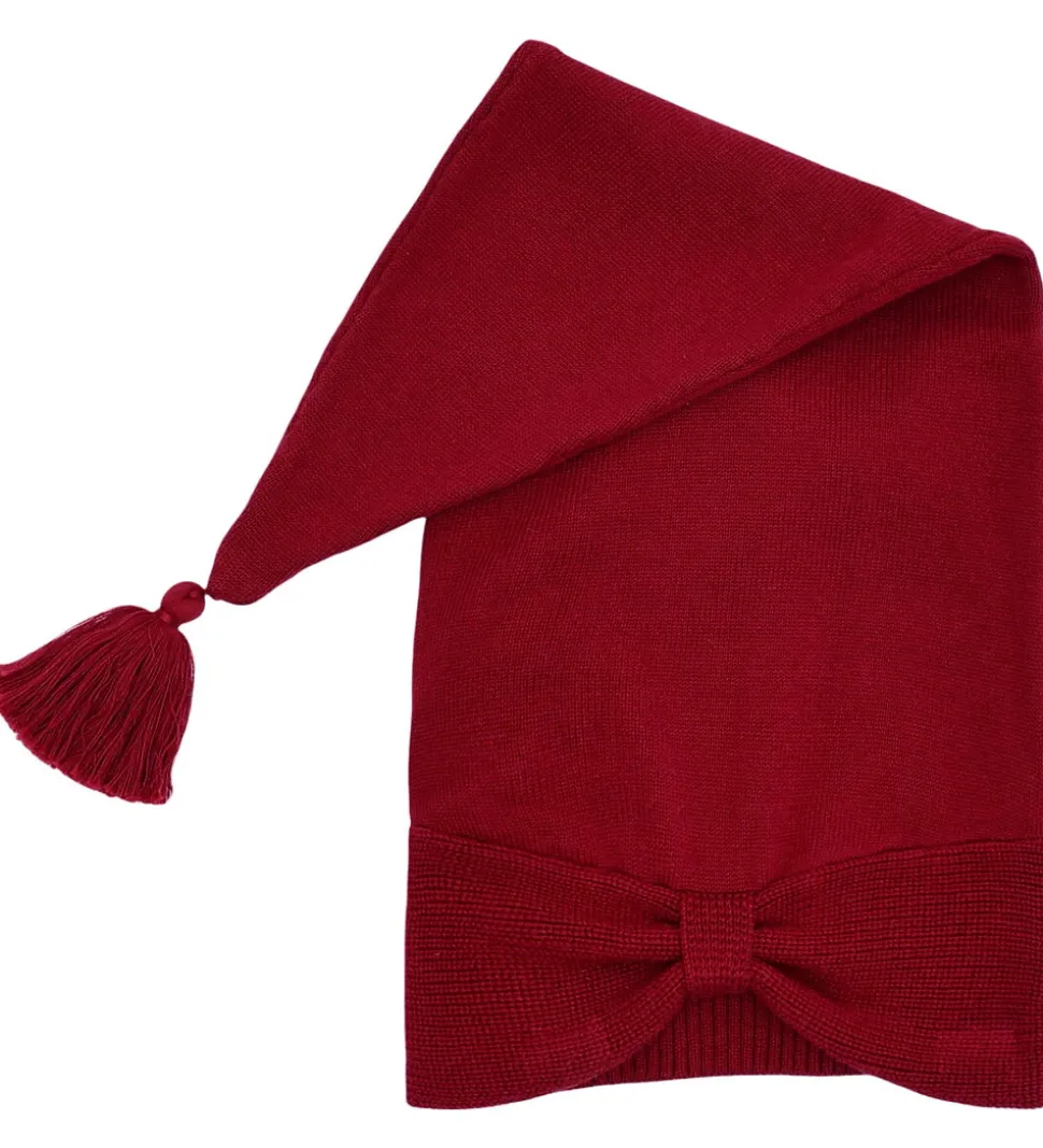 Fin Hust and Claire nissehue i en dyb, rød farve. Hust and Claire huen har en dekorativ kvast på spidsen og en flot sløjfe foran, der tilføjer et sødt touch til designet.