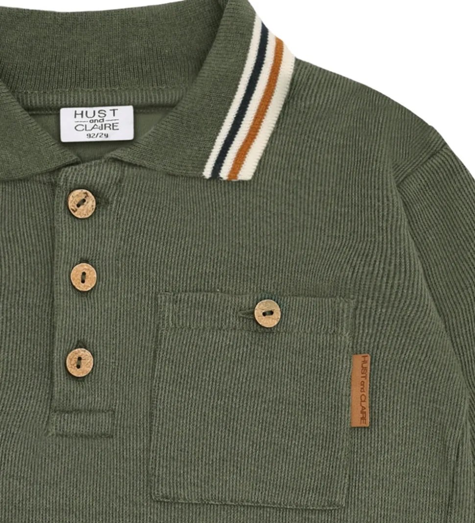 Elegant polobluse fra Hust and Claire med lange ærmer i en dæmpet grøn farve. Poloblusen har en klassisk polokrave med striber i kontrastfarver samt ribkanter ved ærmerne. På fronten ses en praktisk brystlomme samt knapper i en naturlig træfarve. Hust and Claire sikrer et stilrent design.