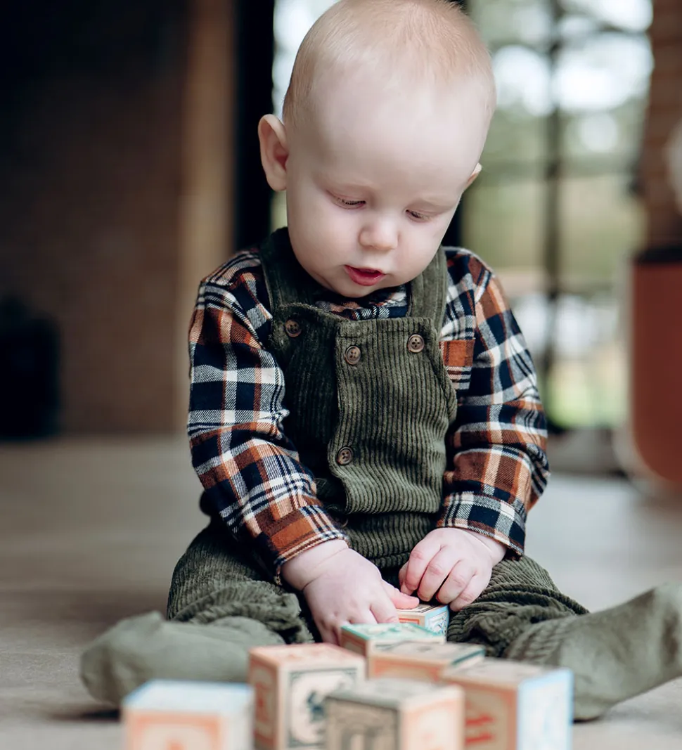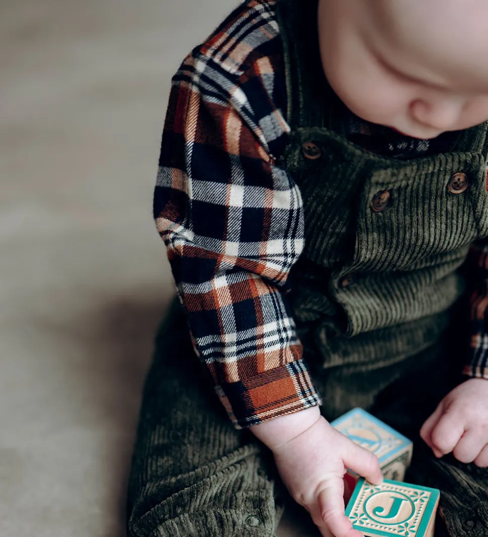 Skjortebodyen er lavet af flonel i toppen, mens den er lavet af bomuldsjersey i bunden.