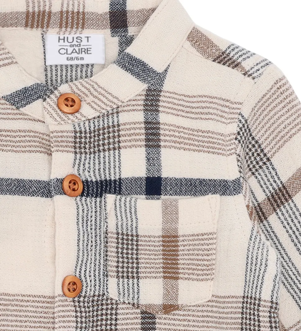 Flot Hust and Claire skjortebody i creme med et ternet mønster i brun og navy. I toppen er den lavet i en fastvævet kvalitet, og i bunden er den lavet bomuldsjersey. Skjortebodyen har lange ærmer med brede kanter og en enkelt manchetknap, og i halsåbningen har den en kinakrave. I venstre side sidder der en brystlomme. Skjortenbodyen åbnes ned ad fronten med knapper, og mellem benene er der trykknapper.
