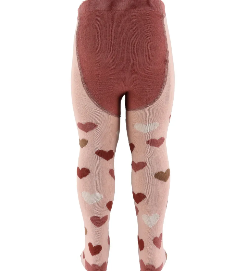 Fine Hust and Claire strømpebukser i en støvet rosa farve med et mønster af små, hjerter i forskellige nuancer. Strømpebukserne har en behagelig elastik i taljen, der sikrer en god pasform.