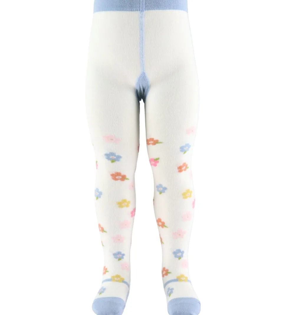 SødeHust and Claire strømpebukser i hvide med blomster i pastelnuancer og med lyseblå kanter.